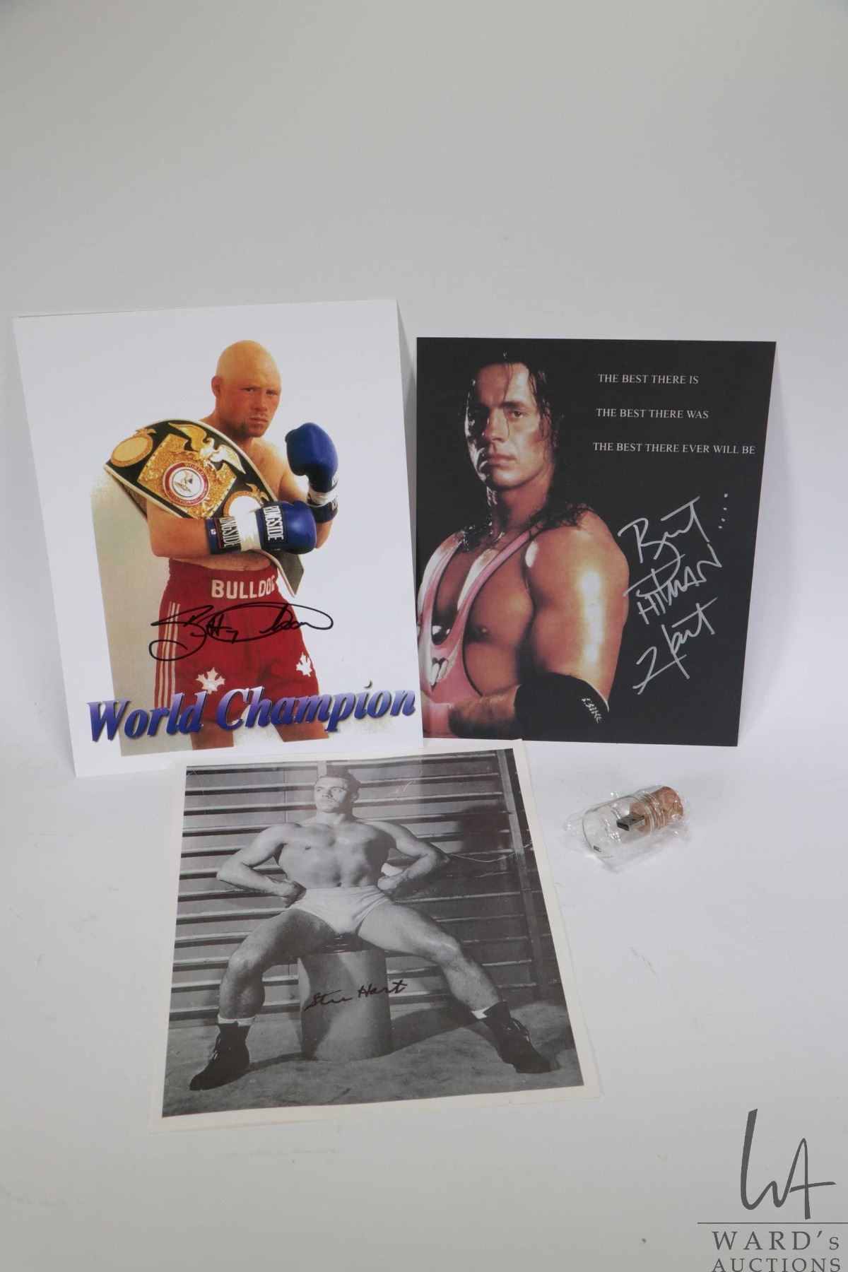 Three hand signed sports promotionals including Brett "The Hitman" Hart, Stu Hart, and Scotty "The Bulldog" Olson and a USB copy of Derek Sweet comedy routine entitled "Miserably Yours". These items are being on behalf of the Support fund for Adults with Disabilities, and will be sold sellers commission free with all monies including applicable buyers premium will be forwarded to the registered charity