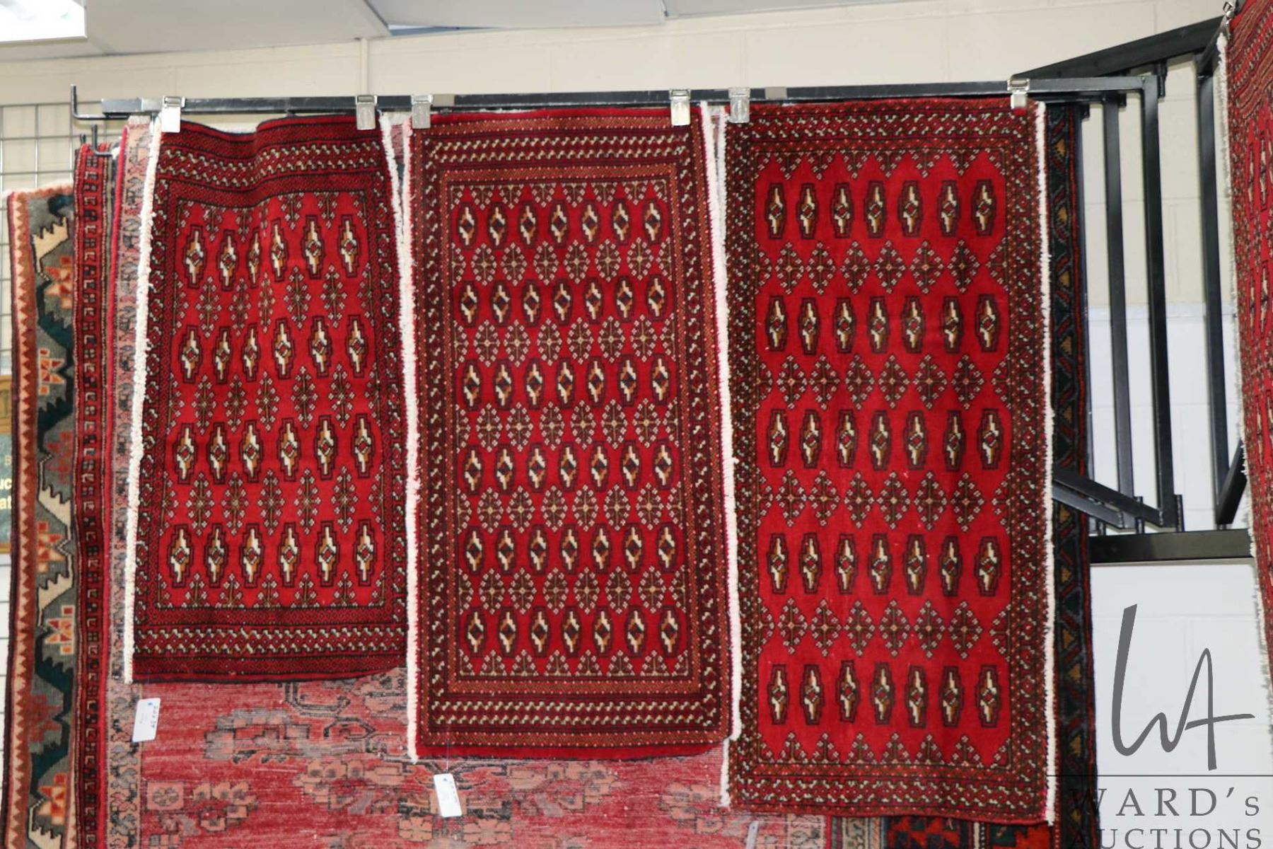 Three handmade Iranian scatter rugs all with red backgrounds and geometric designs, 20" X 39", 22" X 45" and 22" X 50"