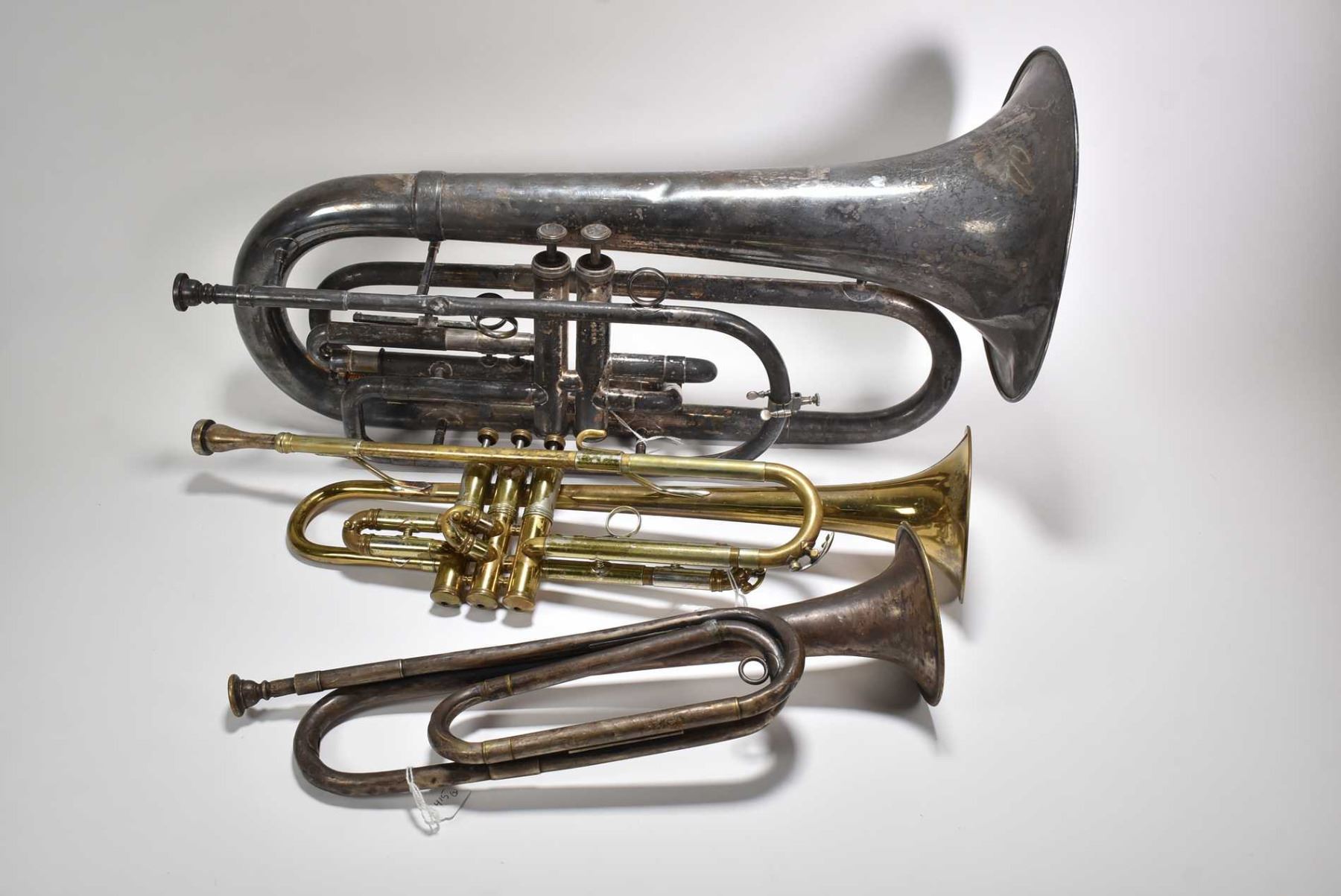 Three horns including trumpet, baritone bugle and a regular bugle, please note distressed condition