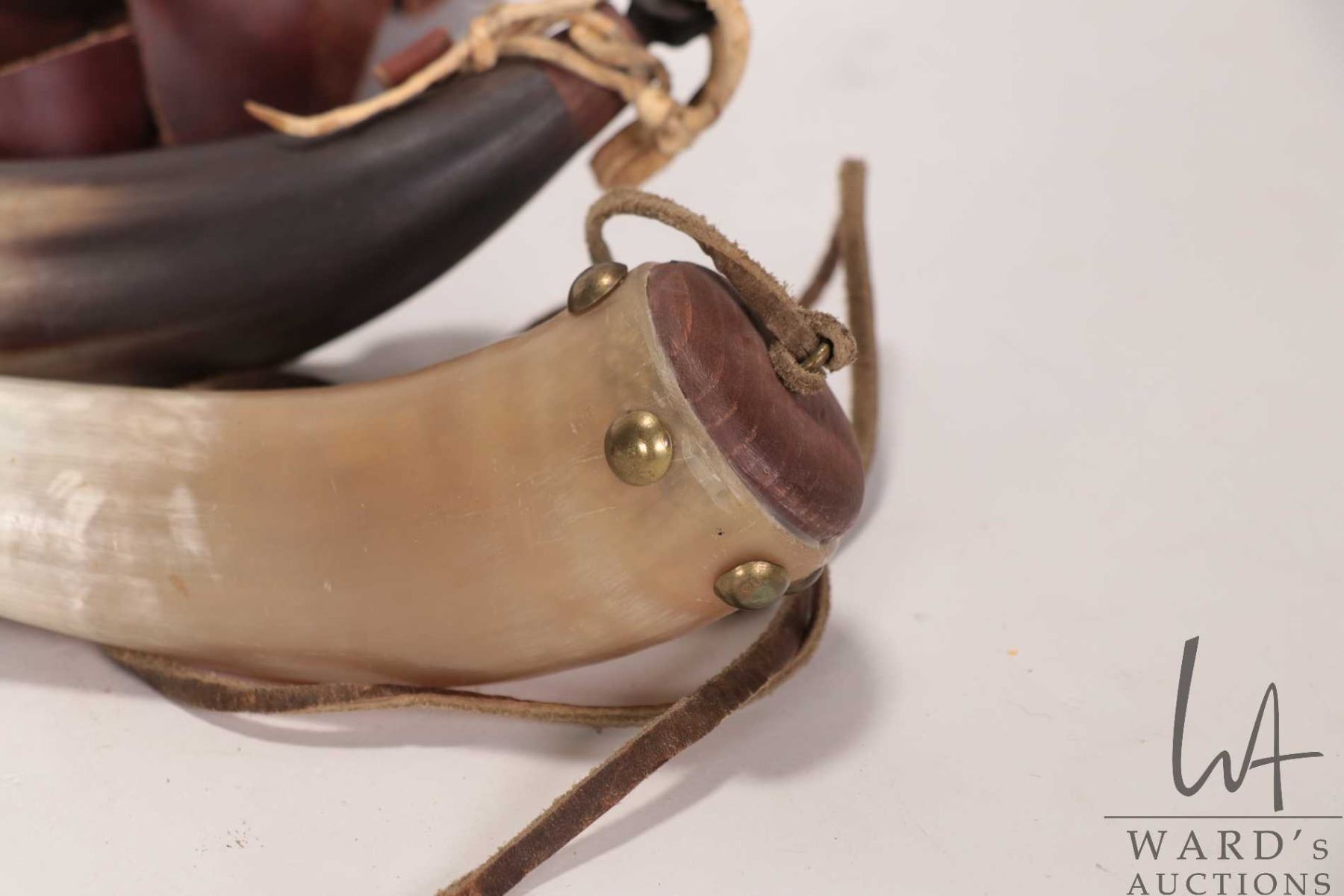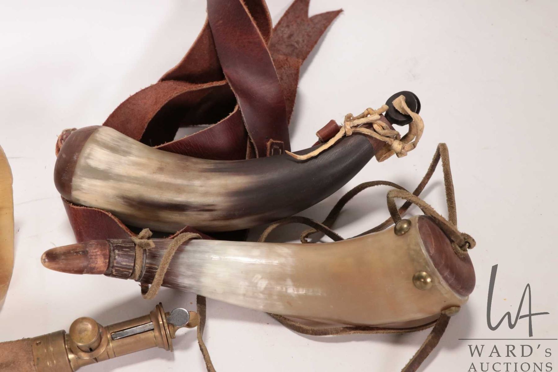 Three horns, two converted to powder horns plus one unmarked brass and leather powder horn