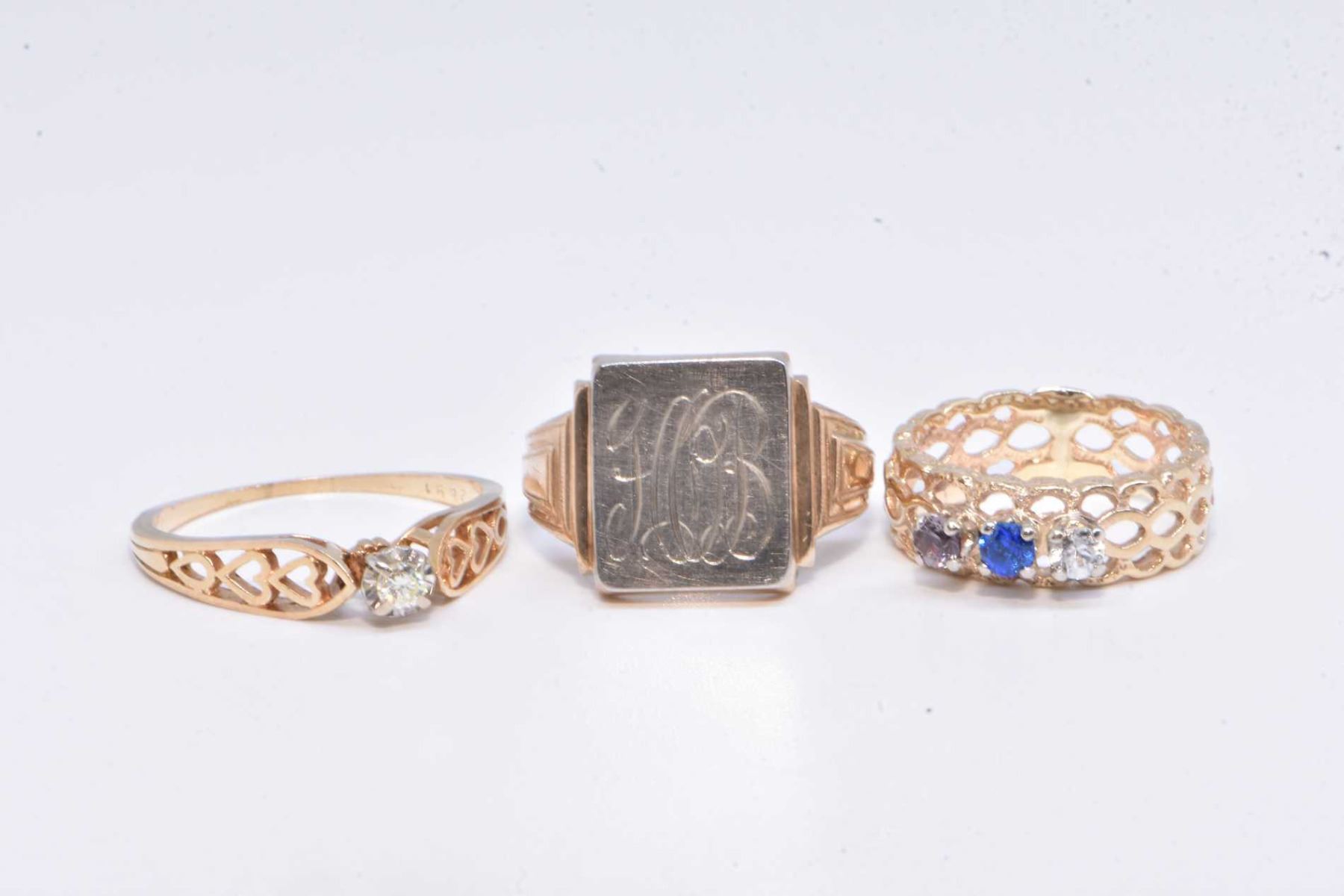 Three ladies gold rings including 14kt yellow gold and solitaire diamond ring, 14kt white and yellow gold signet ring and a 10kt triple gemstone ring