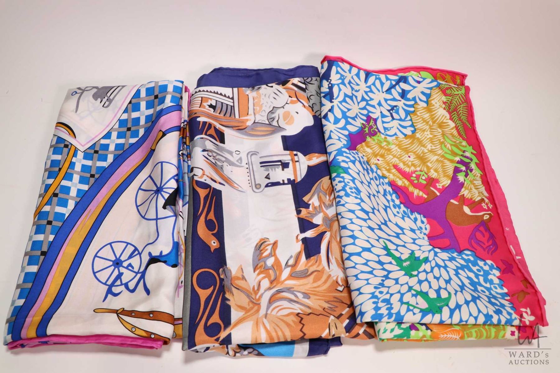 Three large Hermes silk scarves with hand rolled and hand stitched edges-note assume not authentic