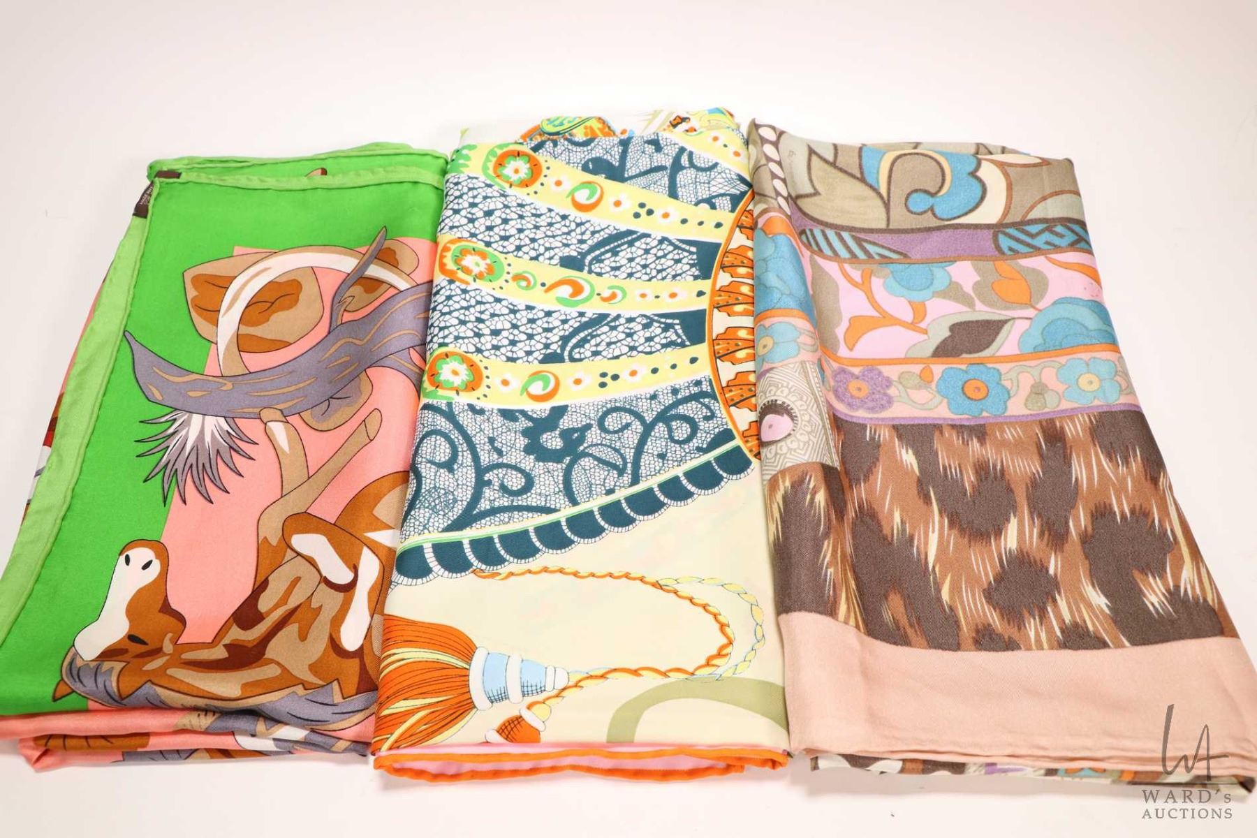 Three large Hermes silk scarves with hand rolled and hand stitched edges-note assume not authentic