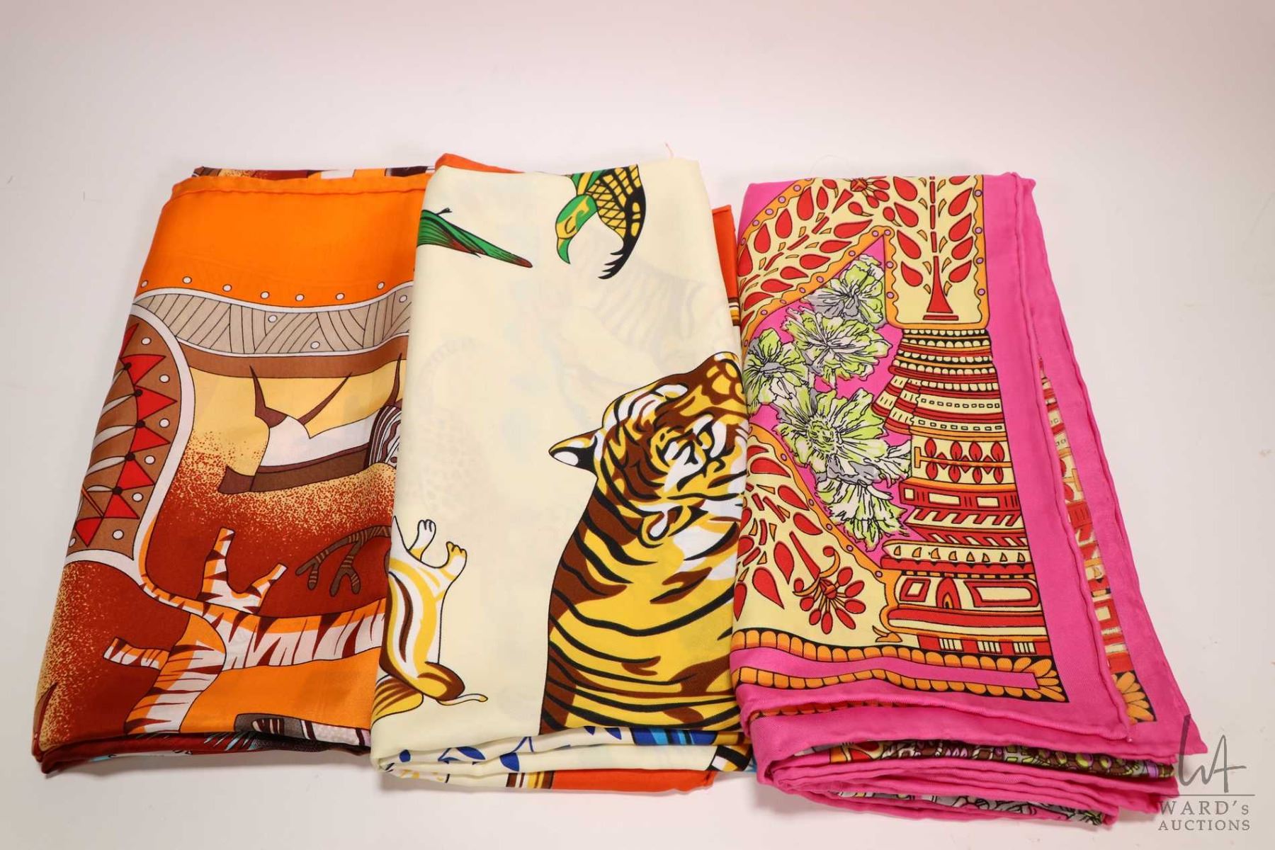 Three large Hermes silk scarves with hand rolled and hand stitched edges-note assume not authentic