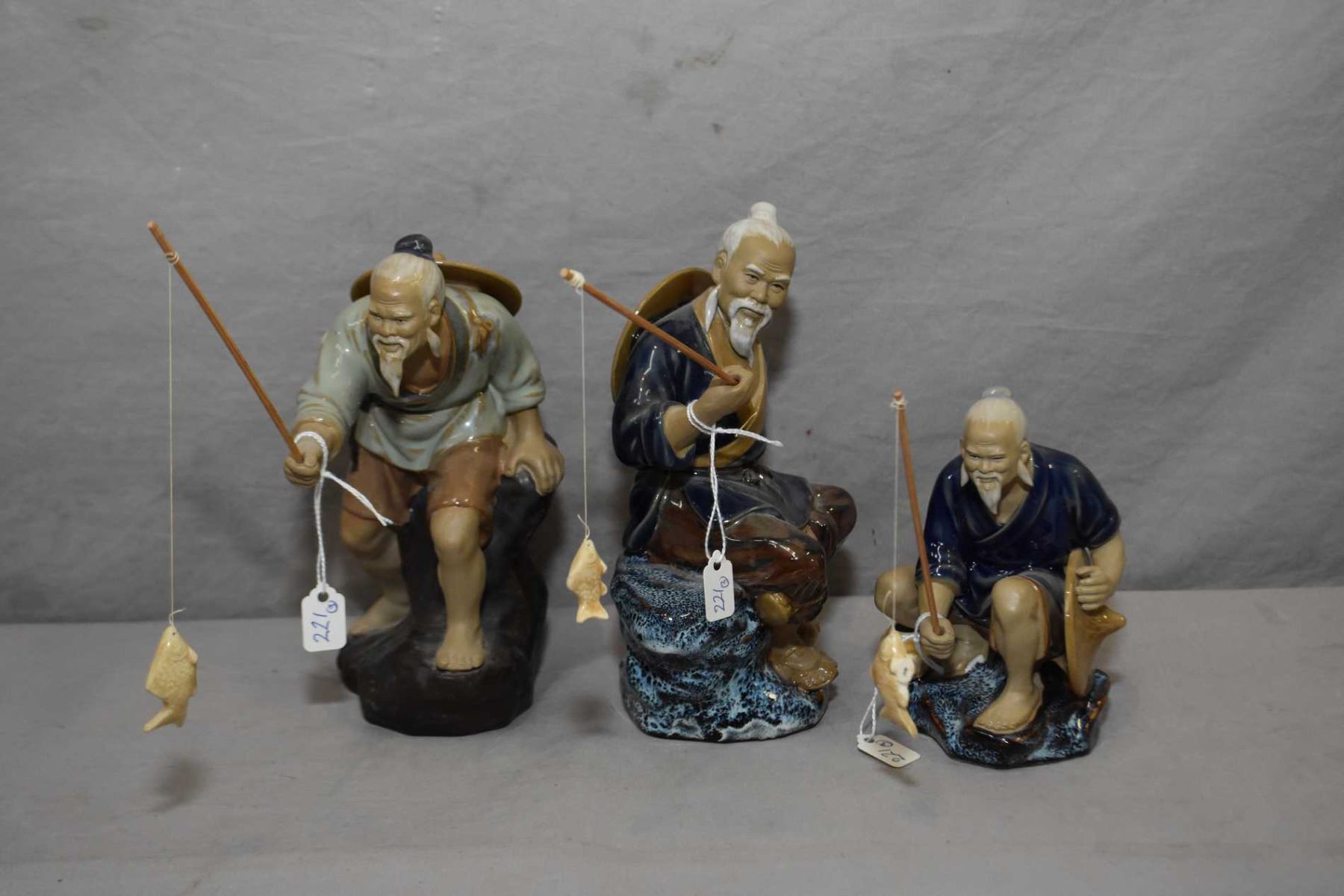 Three large mud men figures including 8" standing with fish on line, and two men sat fishing
