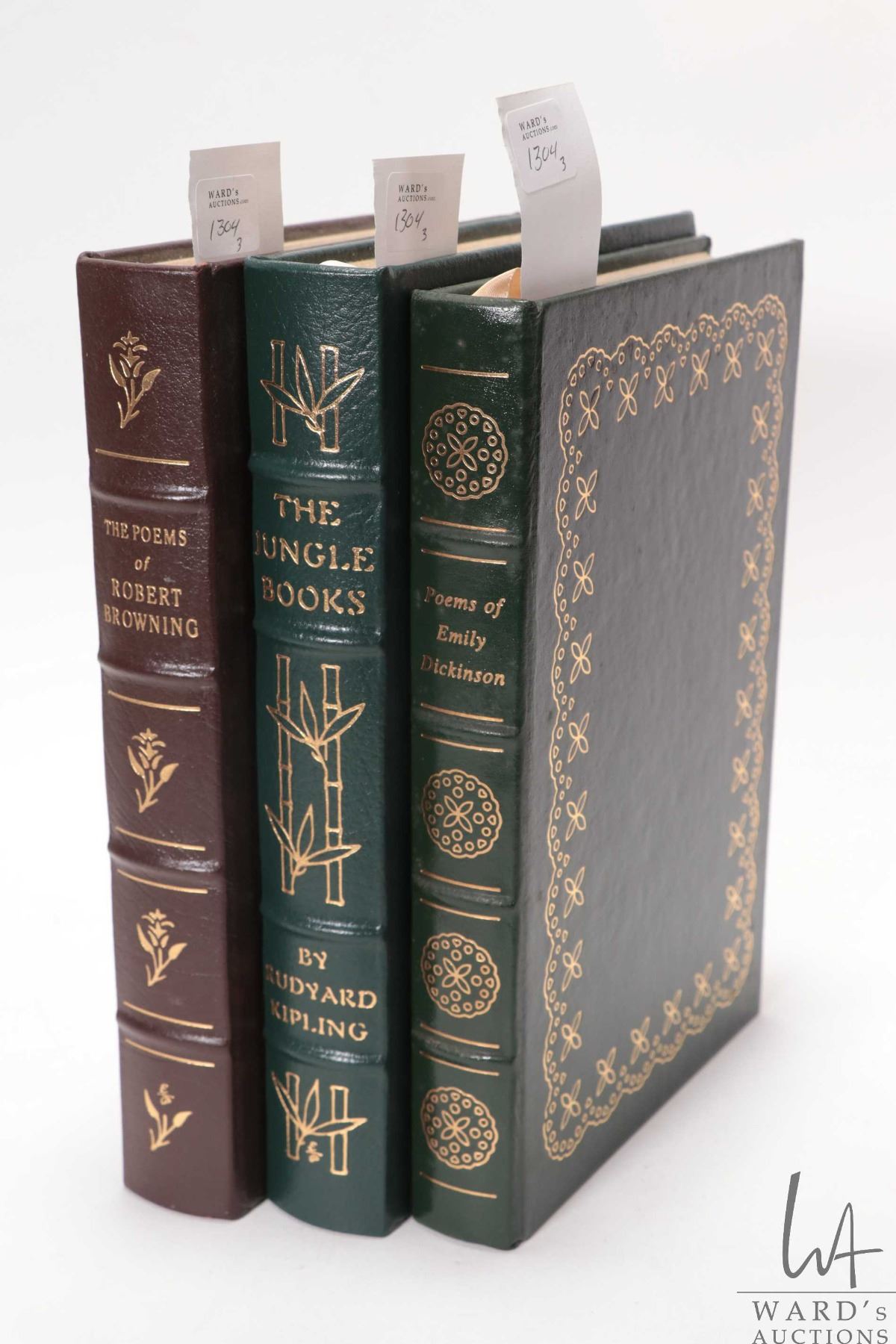 Three leather bound edition of "Masterpieces of American Literature Collector's Edition", published by The Easton Press including "The Poems of Robert Browning", " Poems of Emily Dickinson", and "The Jungle Book", by Rudyard Kipling, each book is leather bound with hubbed spines, accented in 22kt gold, printed on archival paper with gilded edges and all include silk book mark and moire endsheets