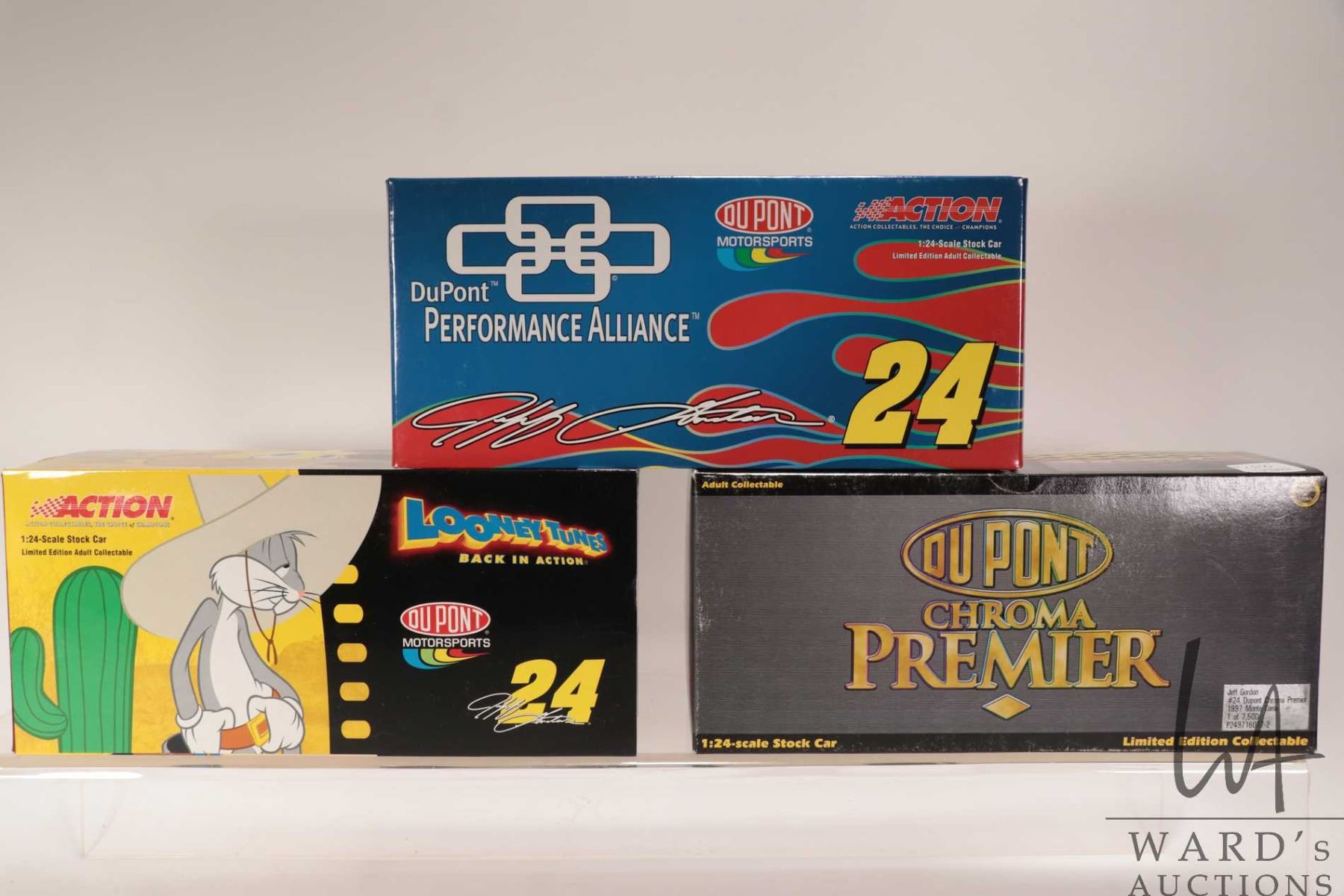 Three limited edition Action 1: 24 scale Jeff Gordon die cast collectible cars including Looney Tunes, Du Pont Chroma Premier and Du Pont Performance Alliance
