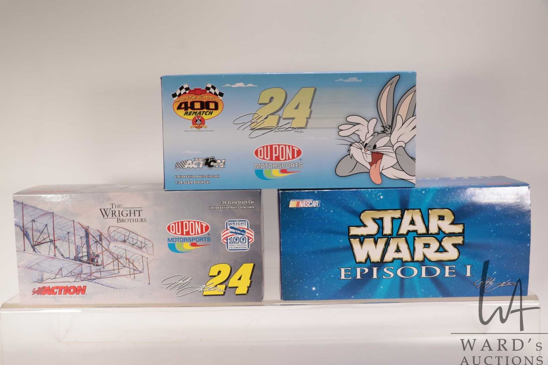 Three limited edition Action 1: 24 scale Jeff Gordon die cast collectible cars including Monte Carlo 400 Rematch, The Wright Brothers and Star Wars Episode 1