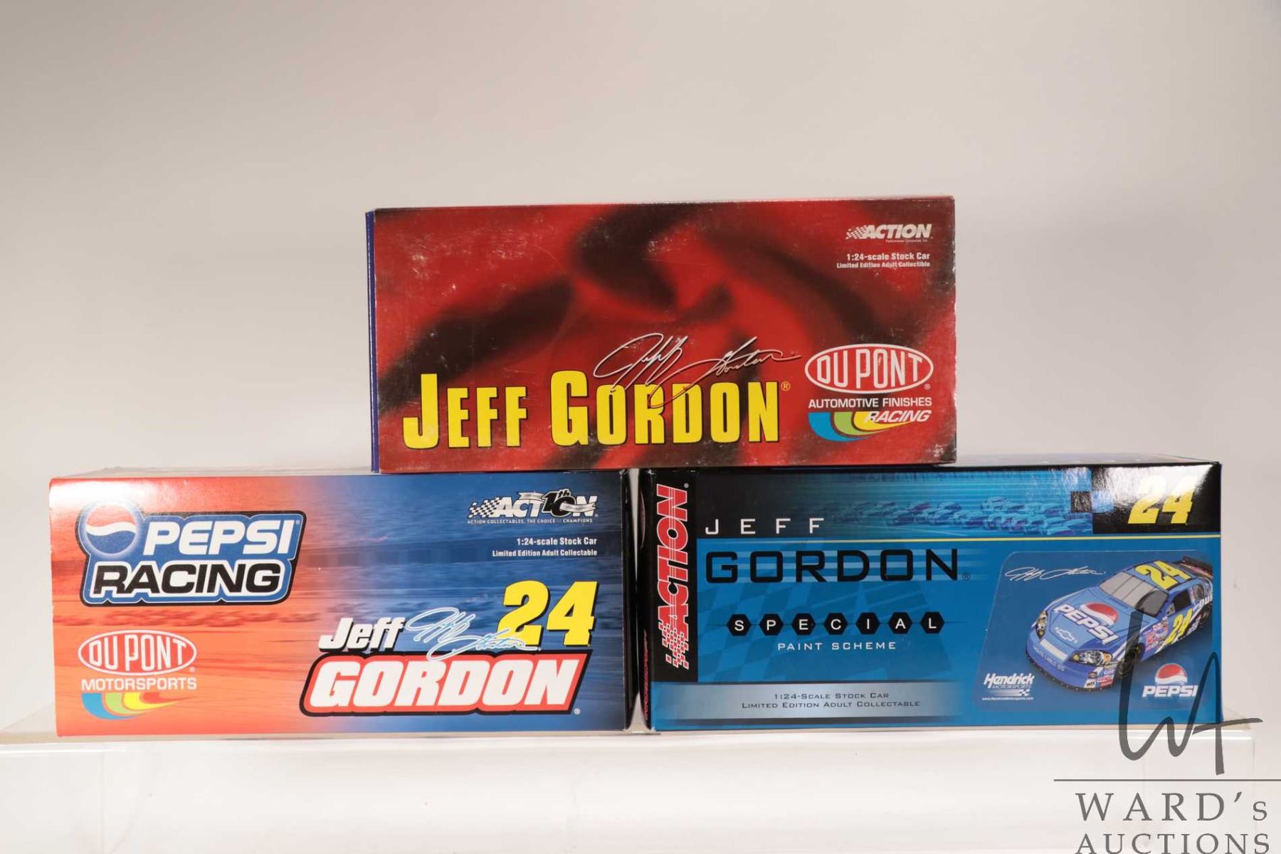 Three limited edition Action 1: 24 scale Jeff Gordon die cast collectible cars including Pepsi Racing, Pepsi Racing Jeff Gordon Special and Du Pont Automotive Finishes