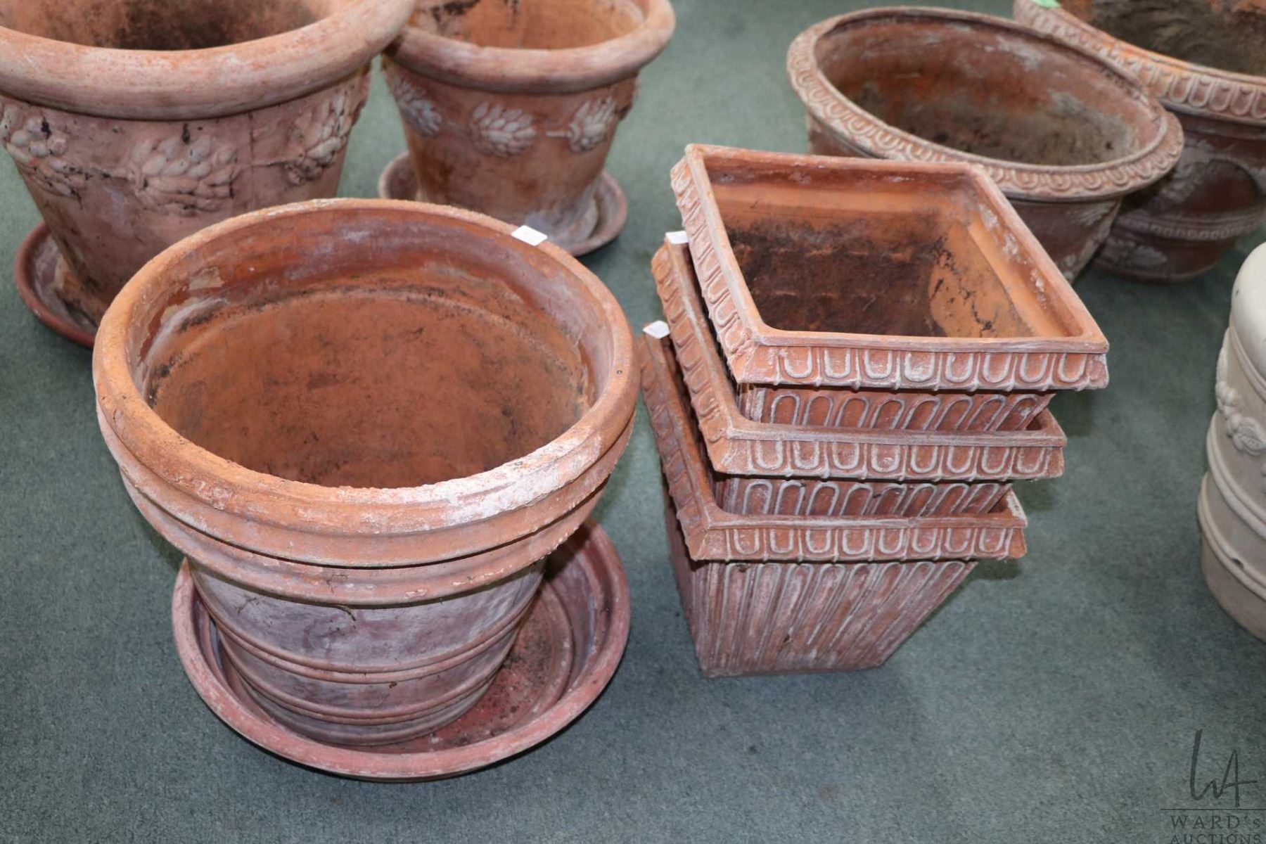 Three matching and one non-matching terracotta planters including 10  and one 14 . Note: Not availab