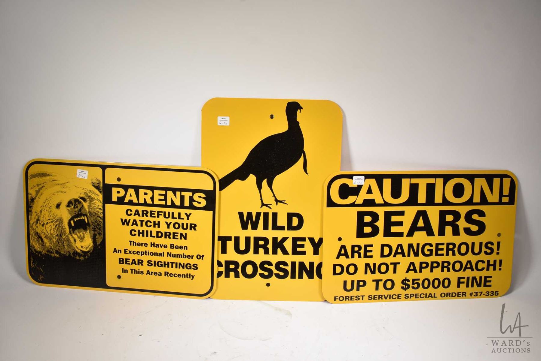 Three metal signs including two bear warning signs and a wild turkey crossing