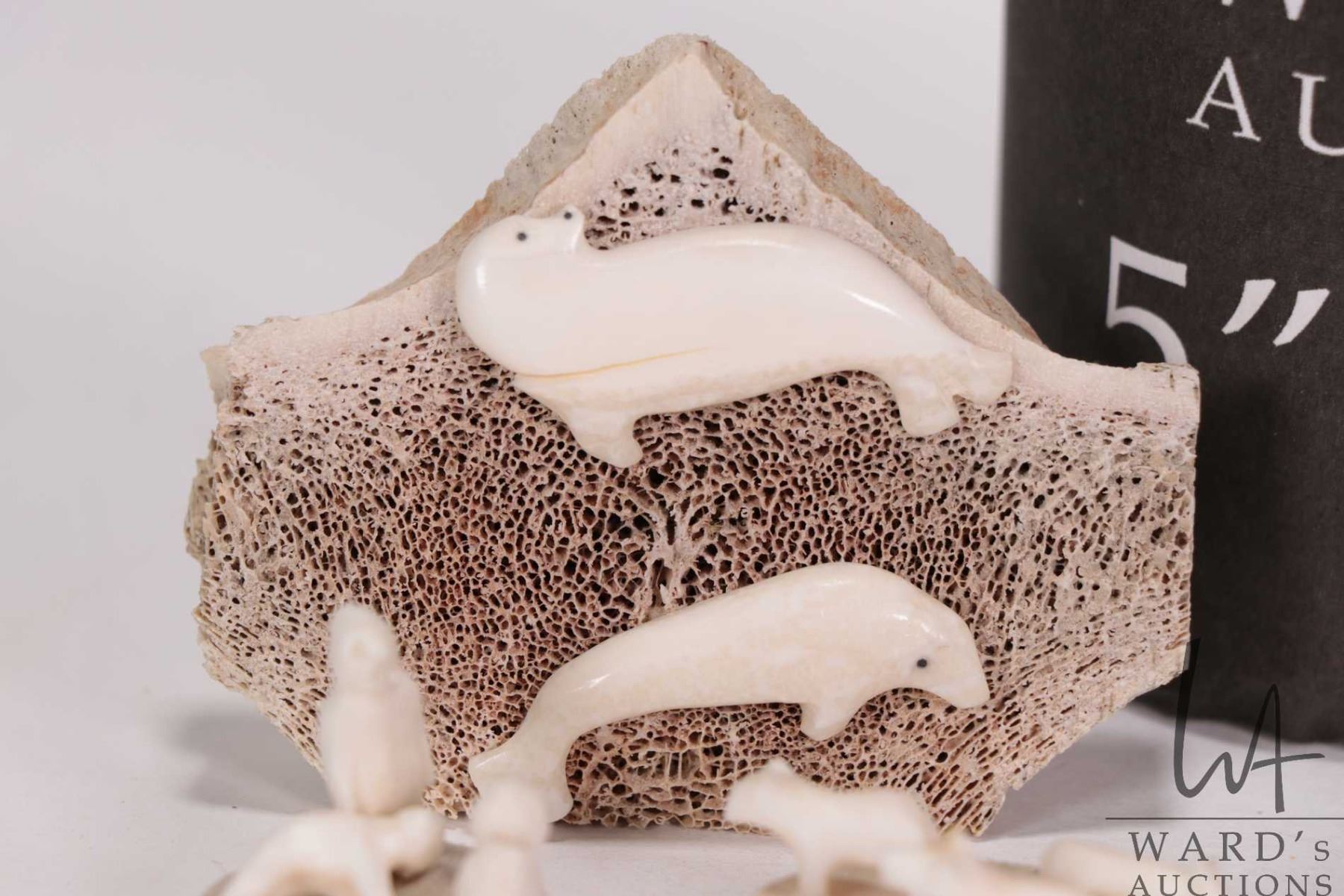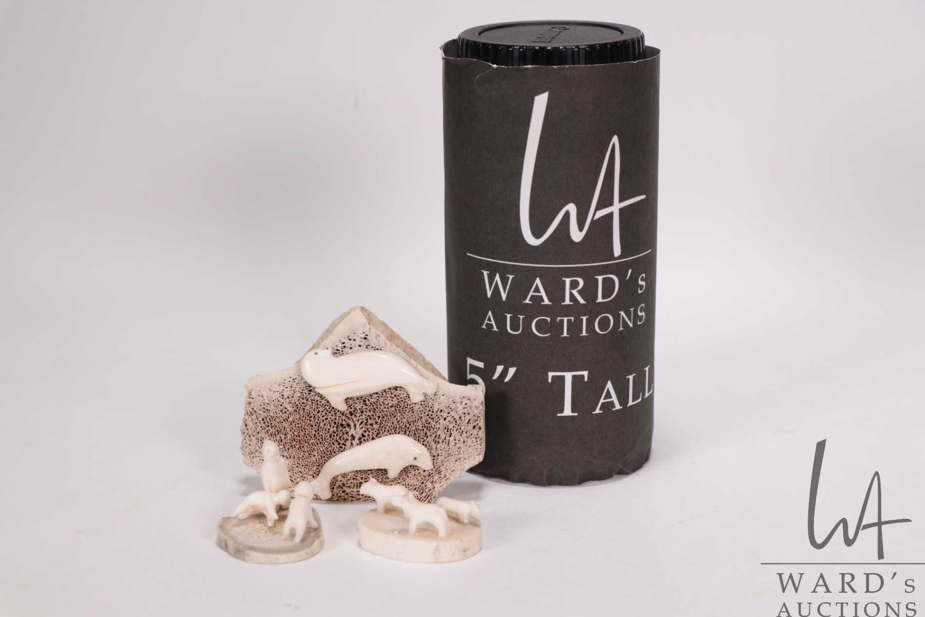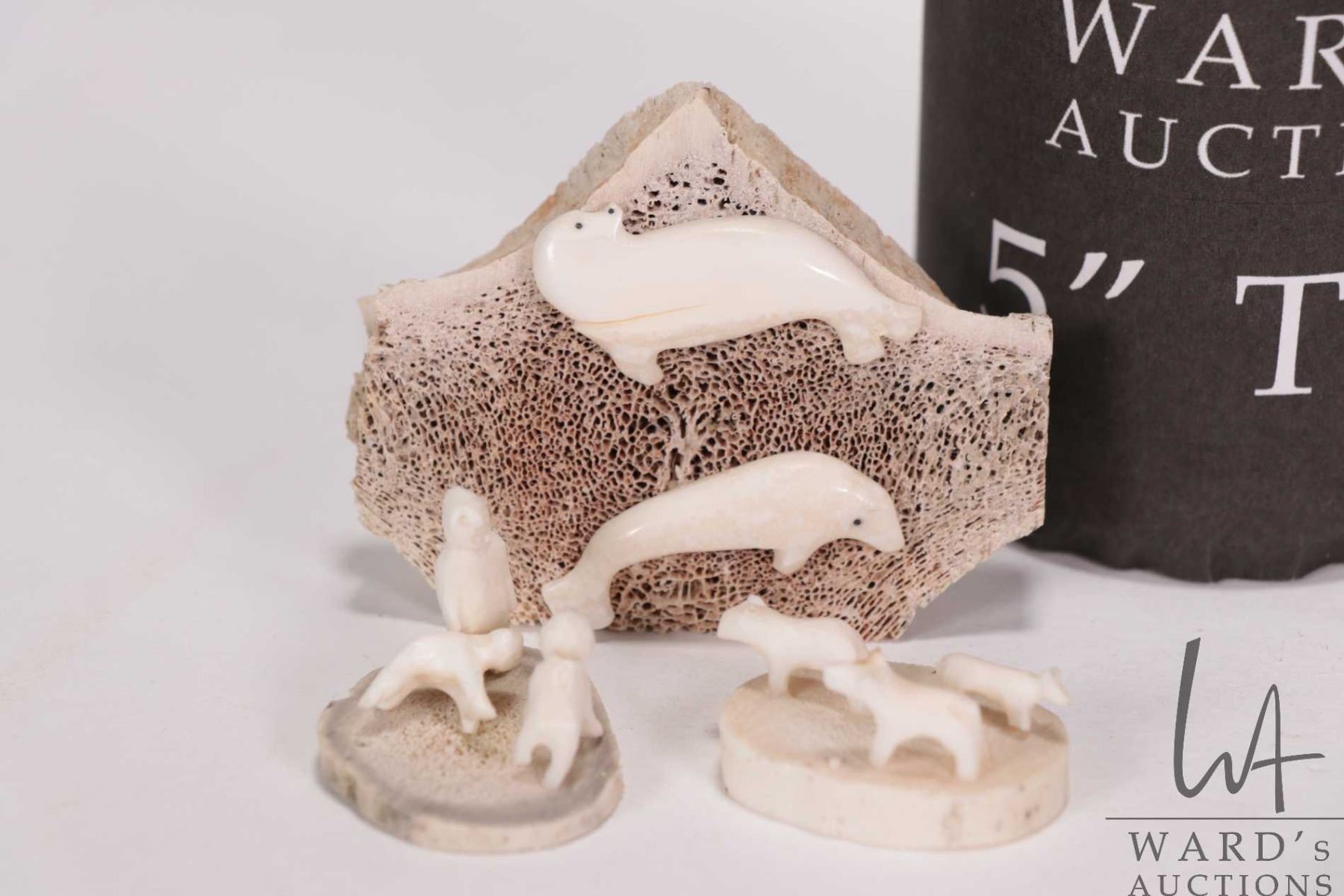 Three miniature Inuit sculptures including marine ivory and vertebrae and seals on antler bases, and Inuit figures with dogs, 1" - 3" in length