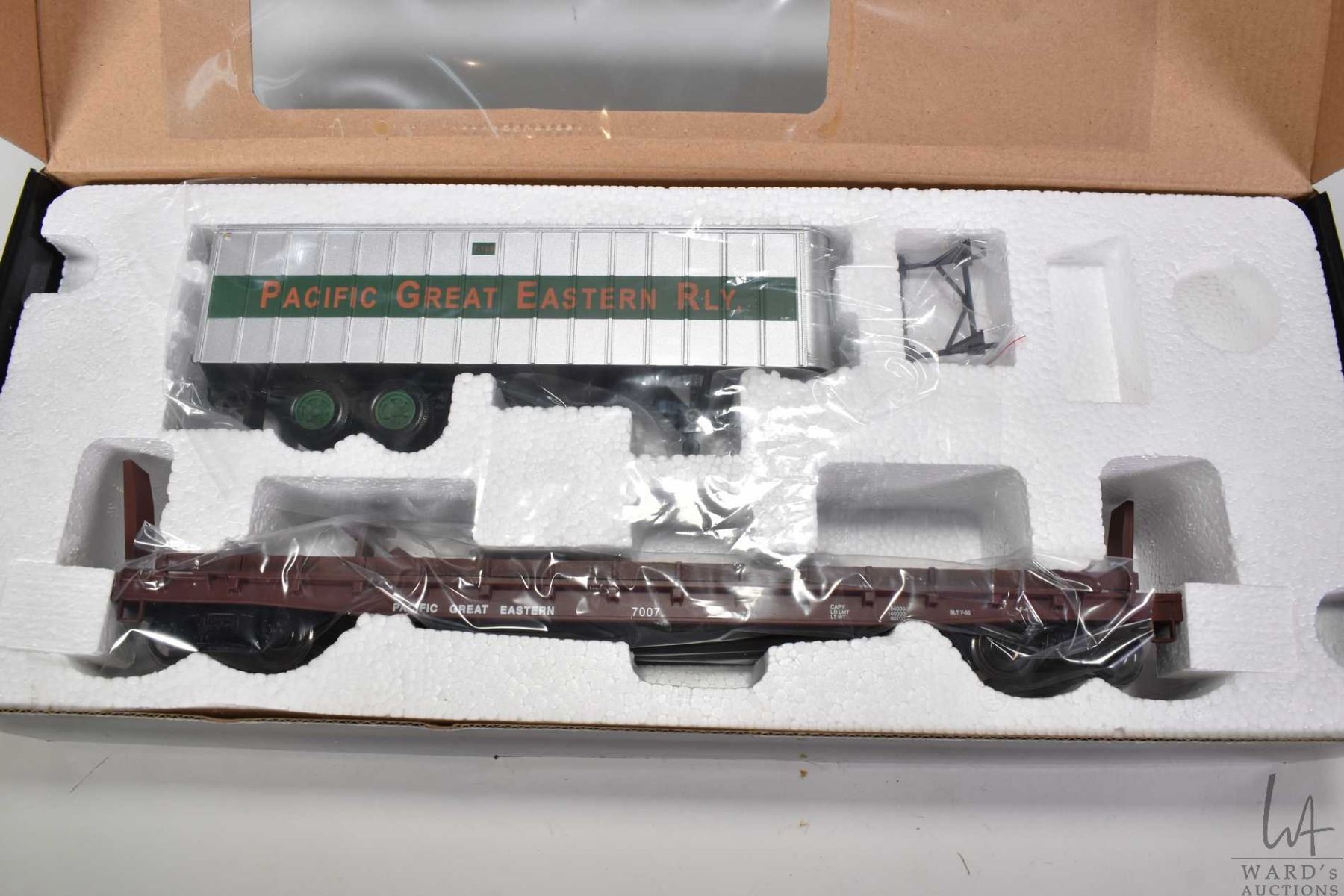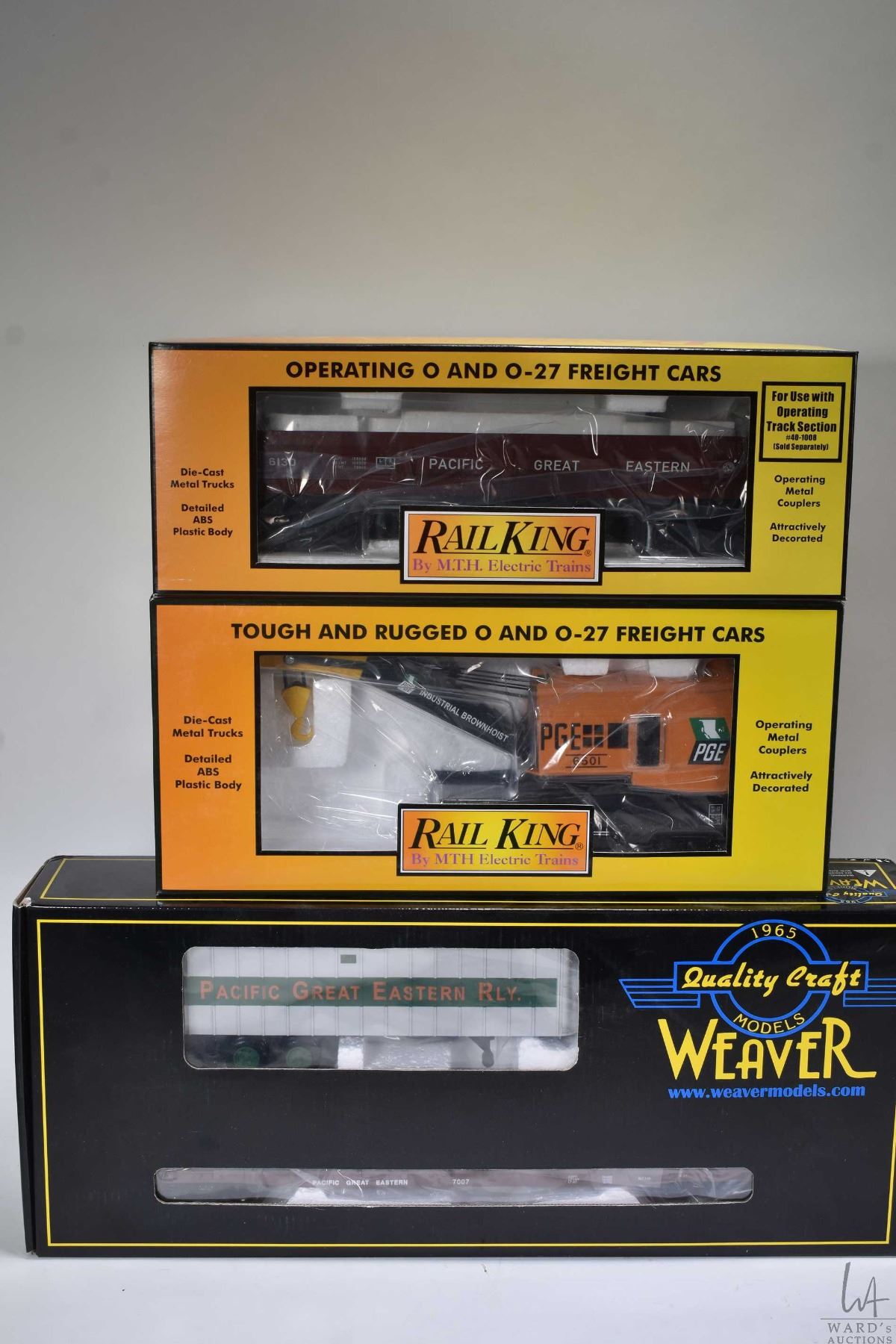 Three new in box O gauge train cars including two M.T.H Rail King; Pacific Great Eastern dump car with operating bay no. 6130 and Crane Car no. 6501 plus a Weaver 50' Flat car with 35' trailer no. 7007