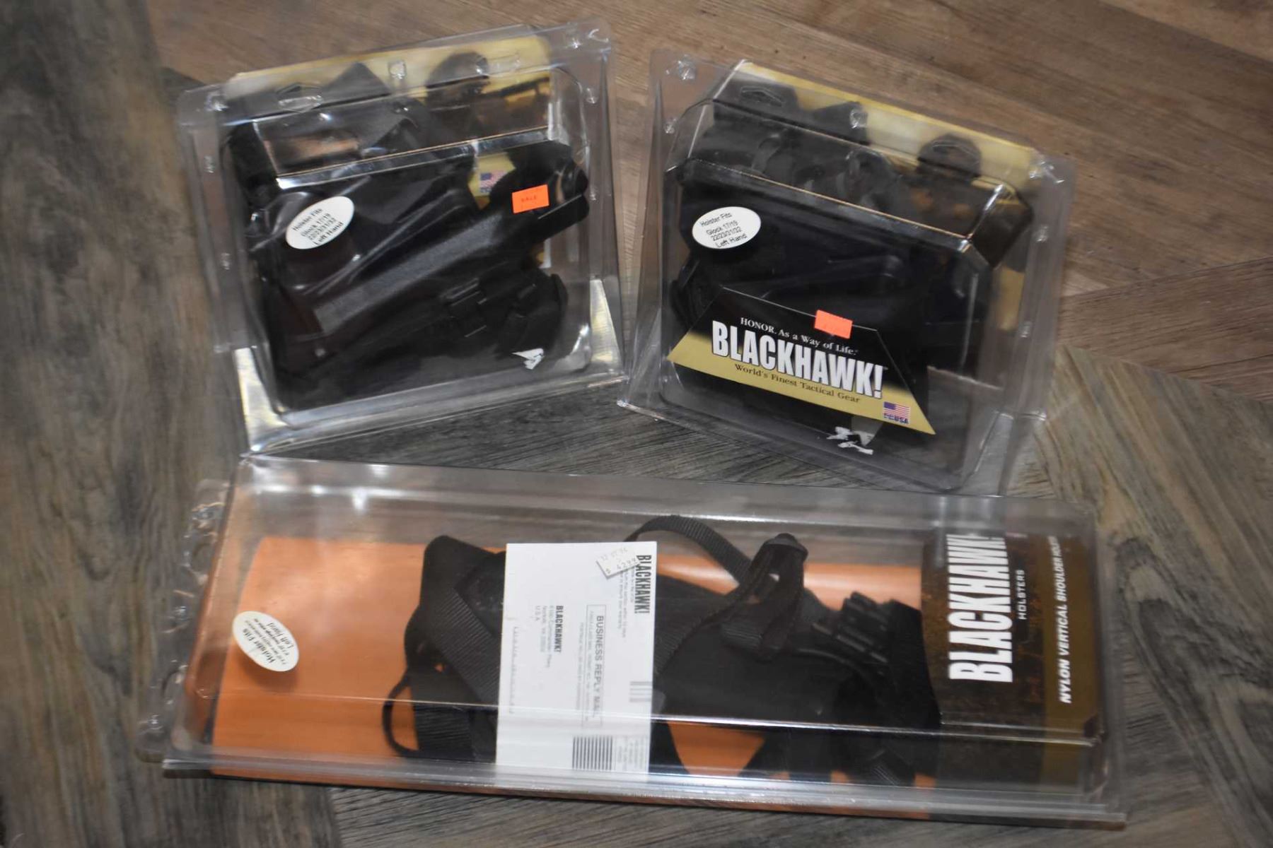 Three new in package Black Hawk left handed holsters including two for Glock 17/19/22/23/31/32 and a shoulder holster for large revolver