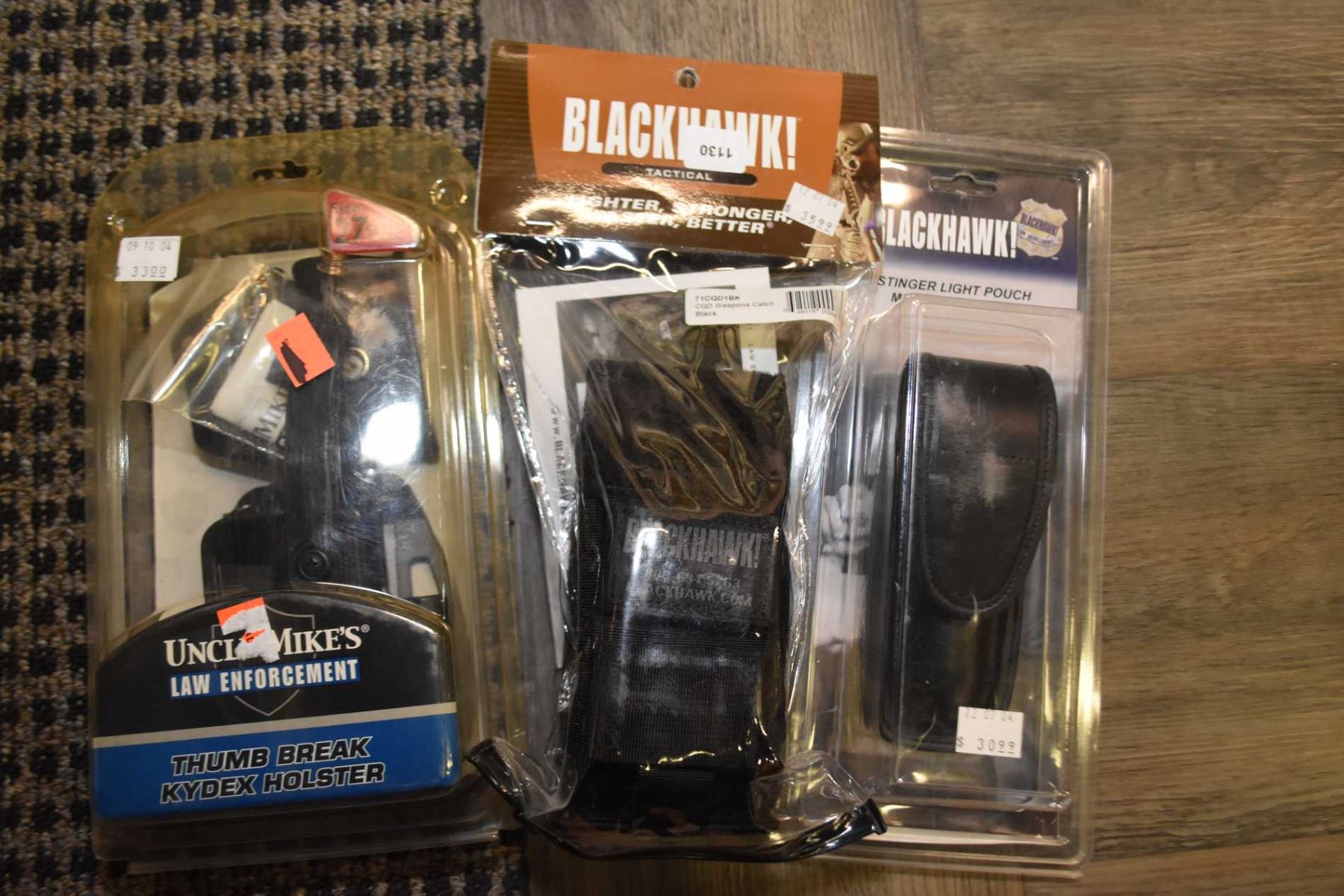 Three new in package firearm accessories including Black Hawk CQD weapon catch, Black Hawk stinger light pouch and an Uncle Mikes size 27 right hand holster no. 5627-1