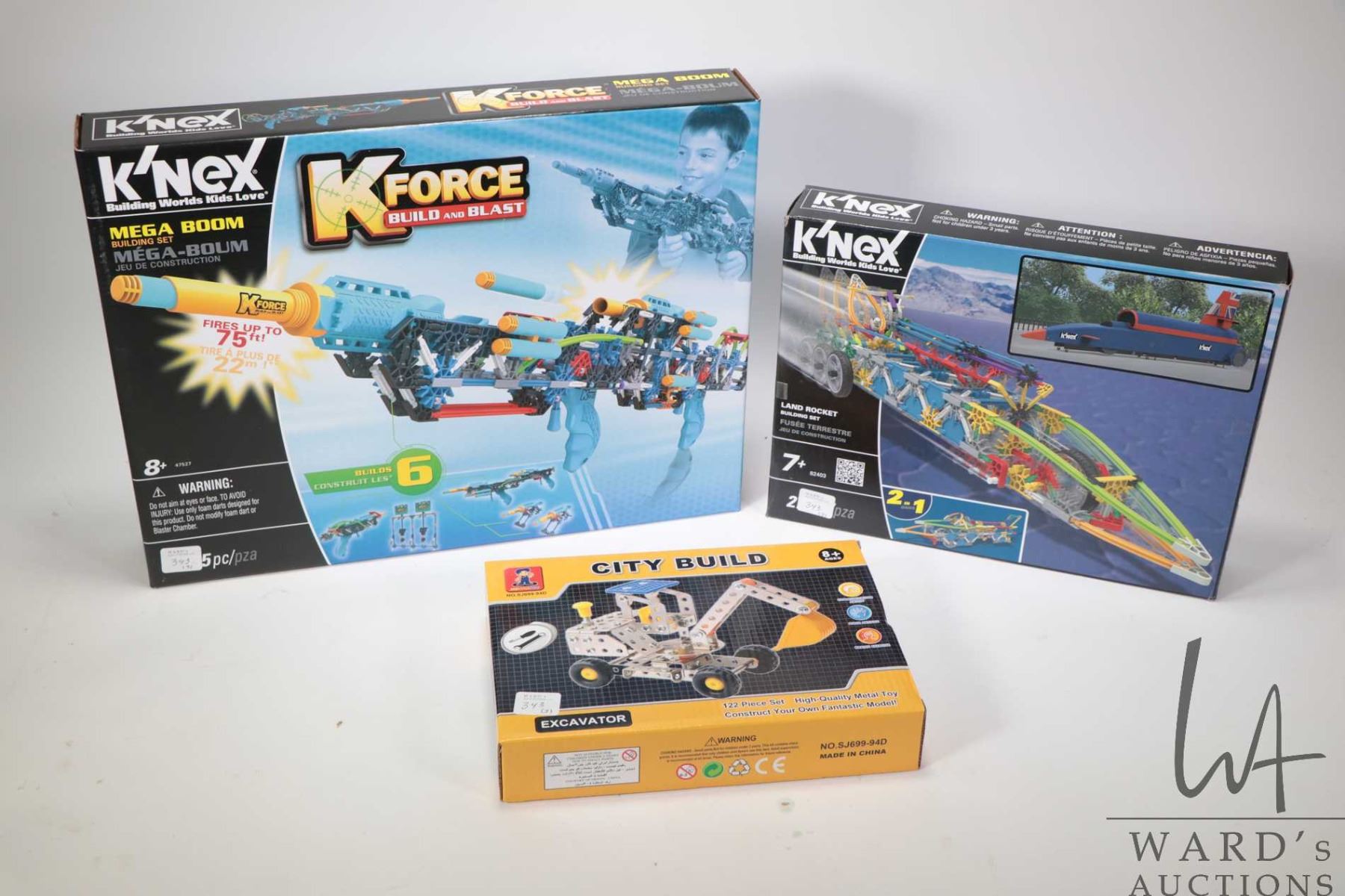 Three new in package toys including Kinex Mega Boom building sets, Kinex Land Rocket Building set and a City Build Excavator