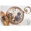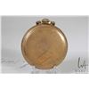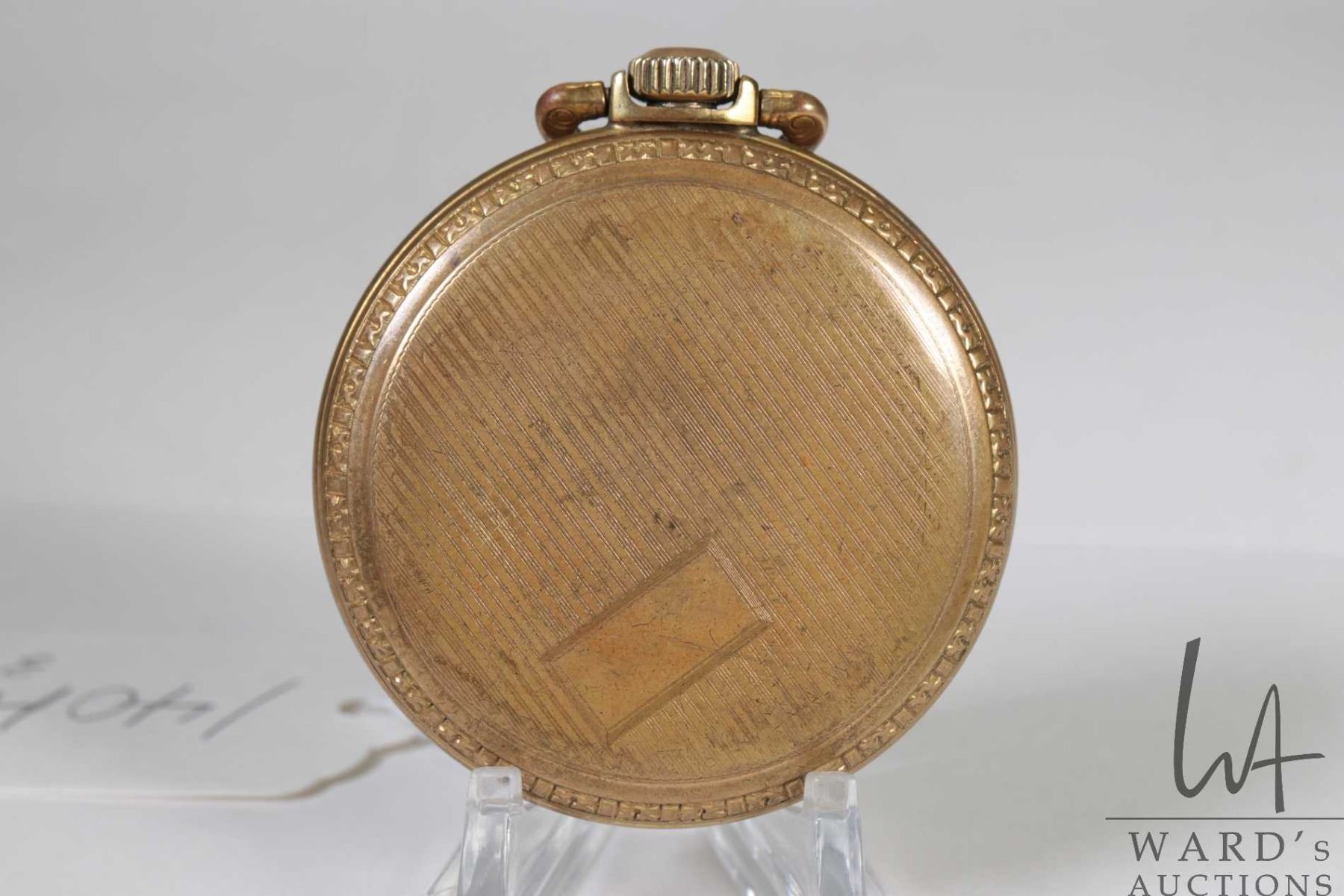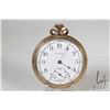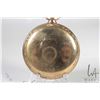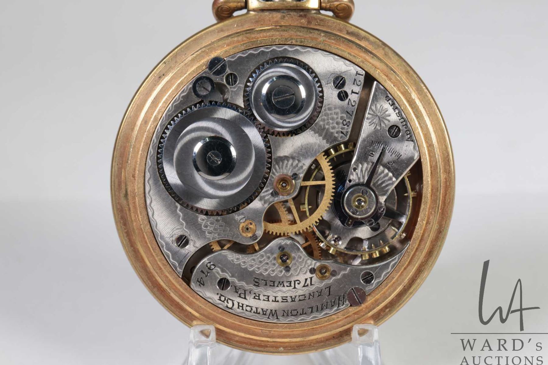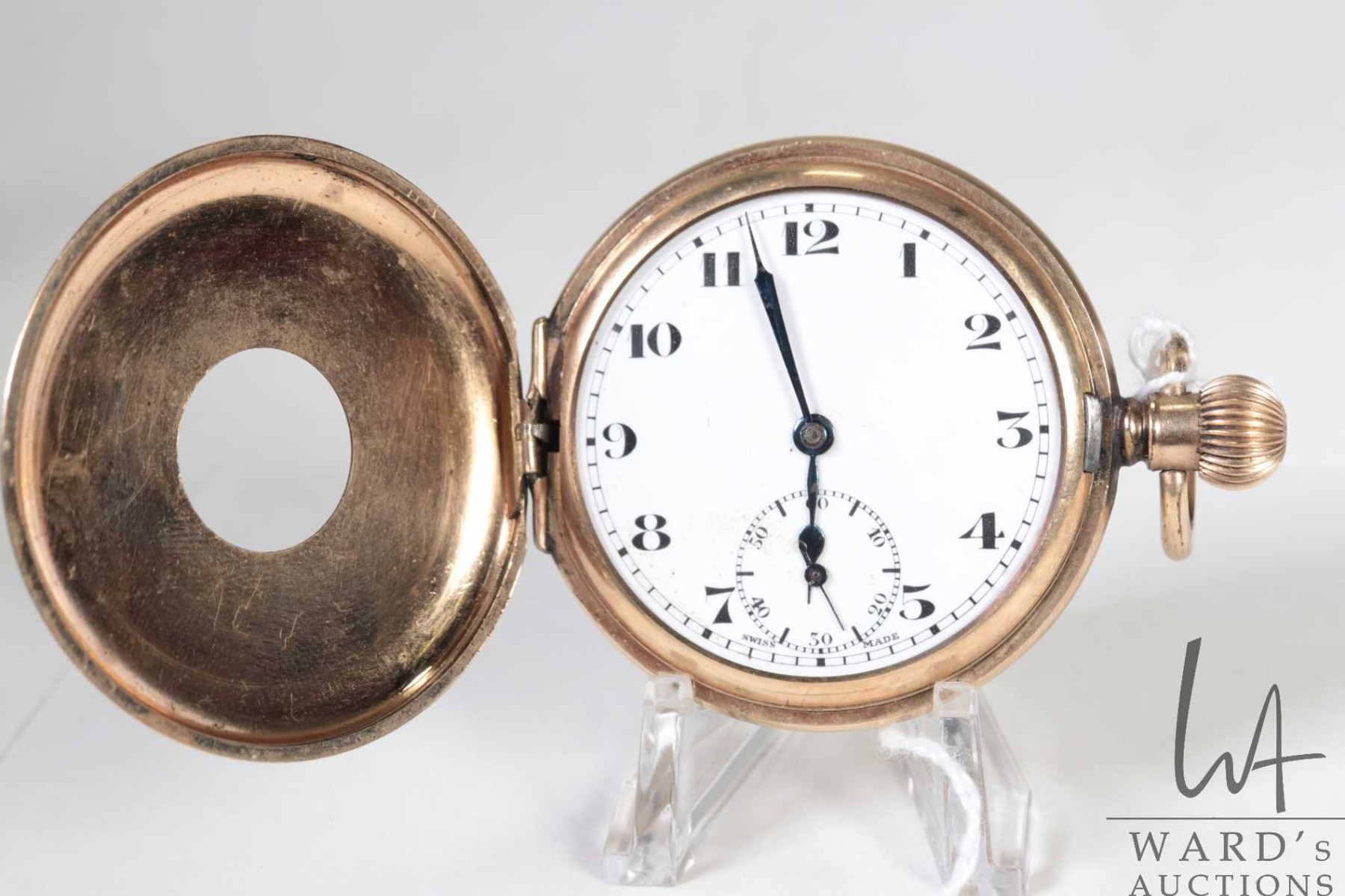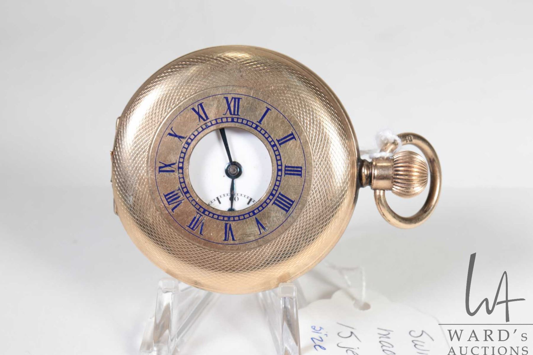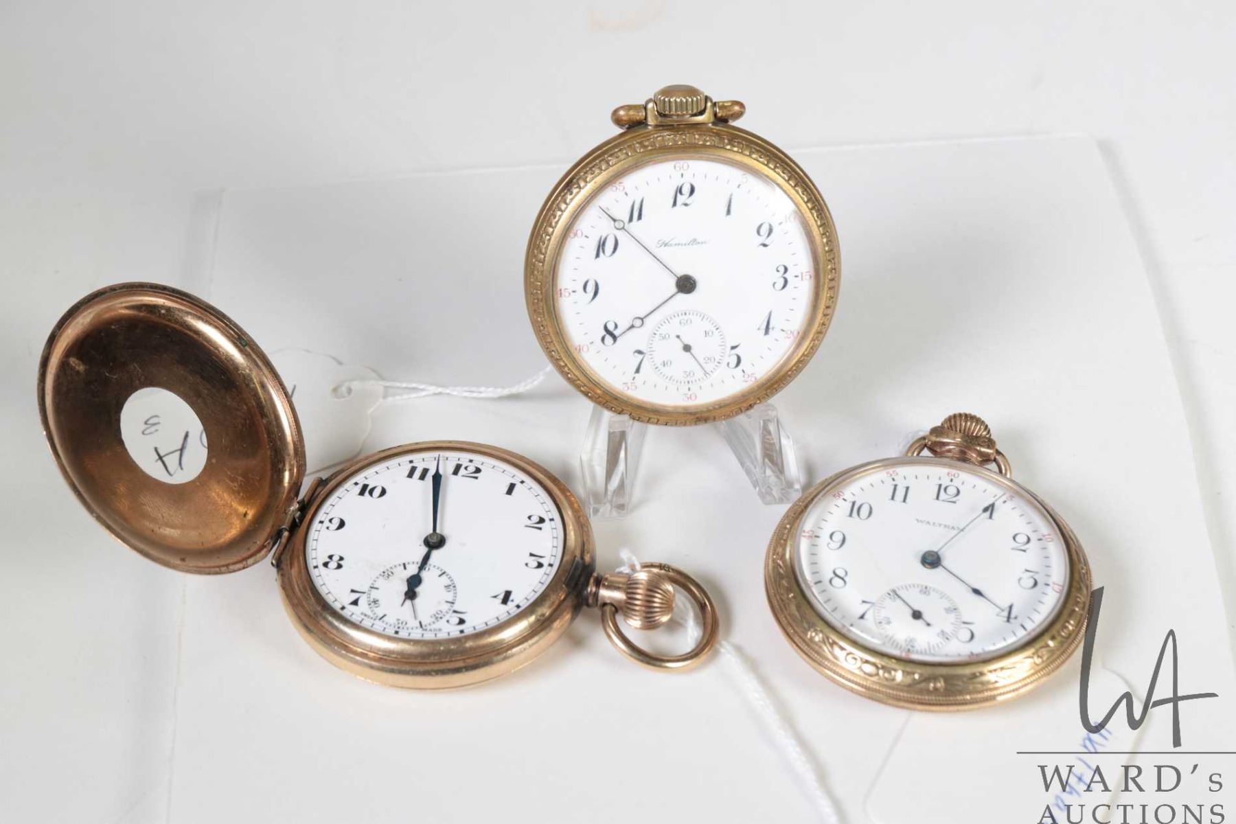 Three non-working pocket watches including Hamilton 17 jewel in base metal open face case with Arabic numerals, single sunk dial with second sweep and black moon hands, Swiss made 15 jewel watch in Elgin demi hunter gold plated case, Arabic numerals, single sunk dial with second sweep and blue spade hands, note missing it's crystal, plus a Waltham pocket watch with Derby rolled plated gold open face case, Arabic numerals, single sunk dial with second sweep and blue fine spade hands, all size 12