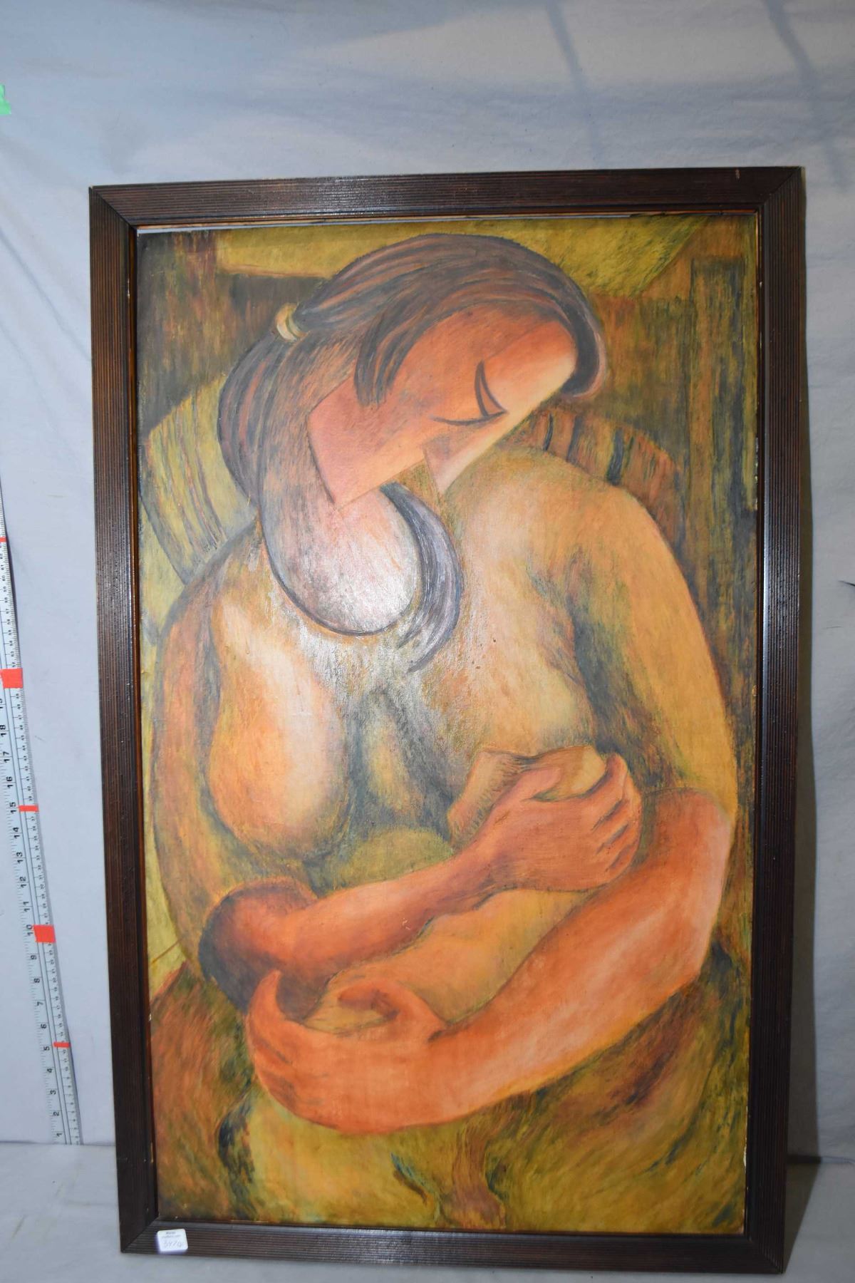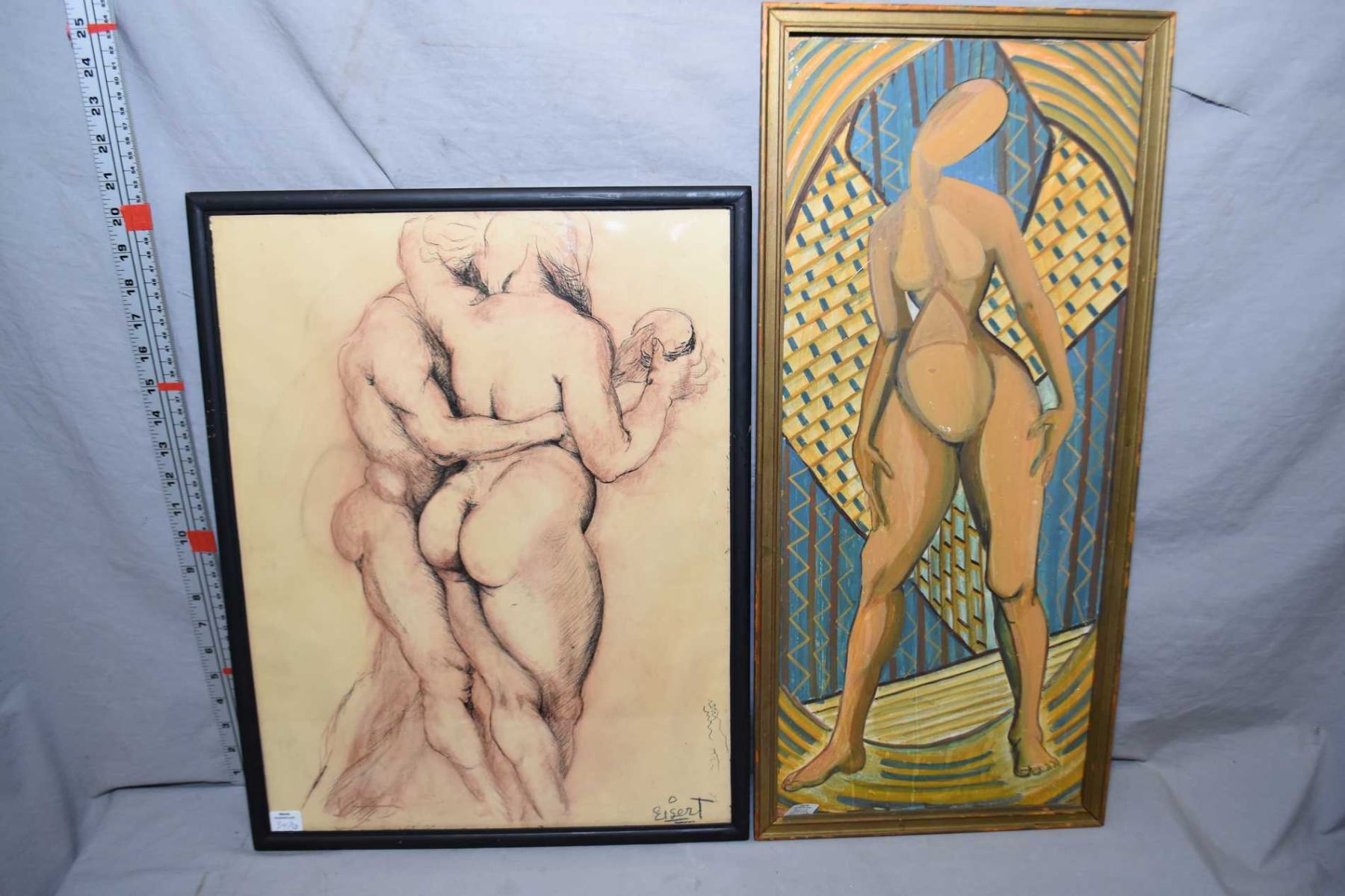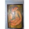 Three original framed artworks including "Study for Doren" signed on verso and artist signed by Gene Eisert 20" X 15", and an acrylic on masonite stylized nude, unsigned 24" X 11" plus an acrylic on massonite of a stylized mother and child, also unsigned, both unsigned pieces are attributed to Gene Eisert 34" X 21"