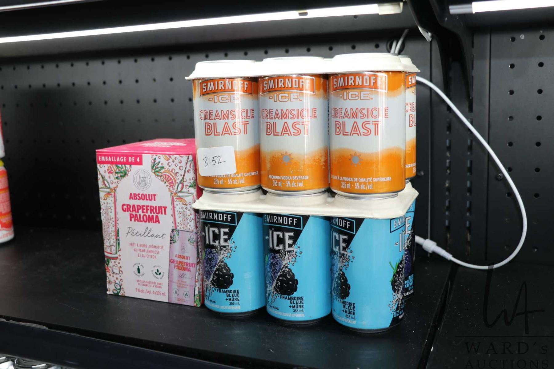 Three packs of assorted alcohol including Smirnoff Ice Creamsicle Blast 6 x 355ml / 5% ABV, Smirnoff Ice Blue Raspberry 6 x 355ml / 5% ABV, and Absolut Grapefruit Paloma 4x 355ml / 7% ABV Note: Alcohol cannot be insured by any courier in Canada. Local pick up is recommended. Canadian bidders only