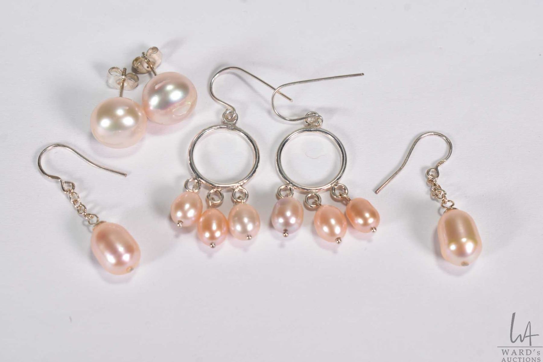 Three pairs of as new coloured pearl earrings including a studs and two with silver Shepard hooks