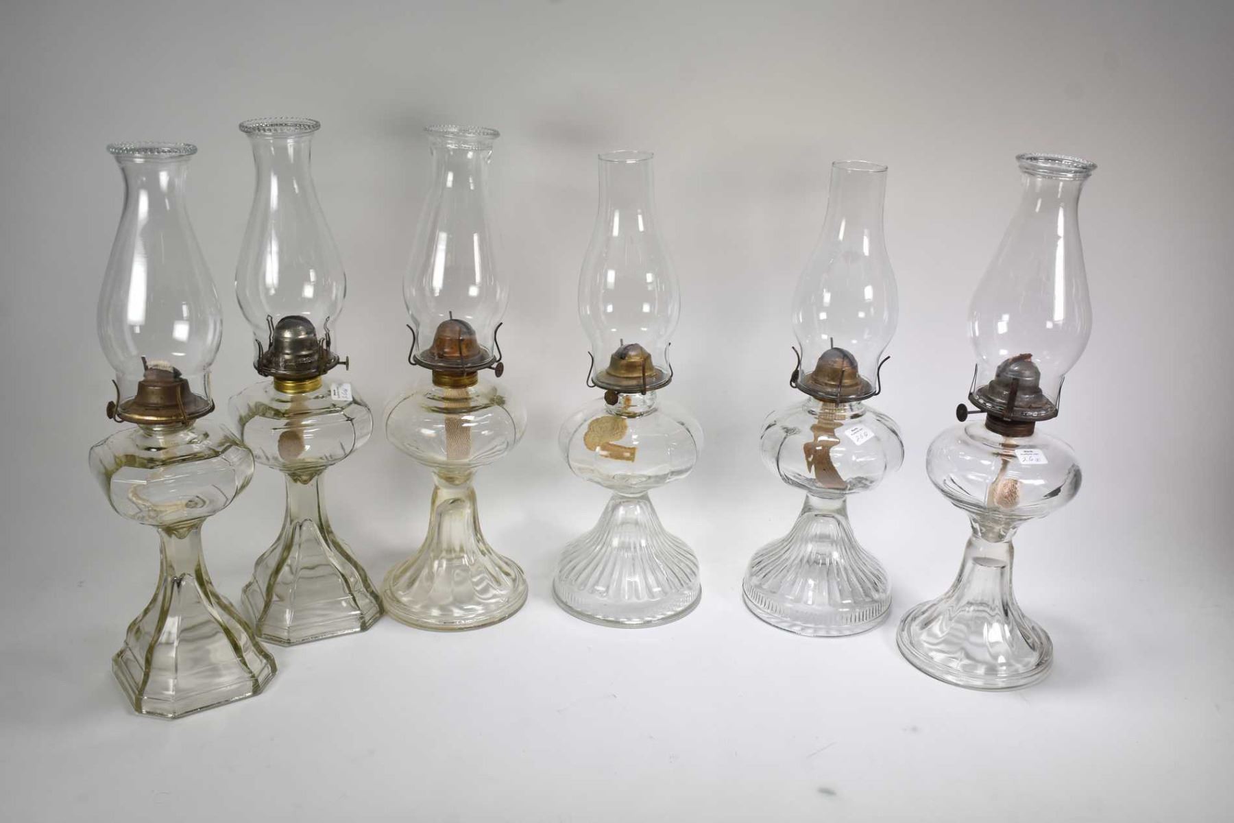 Three pairs of colourless oil lamps, all with hurricanes
