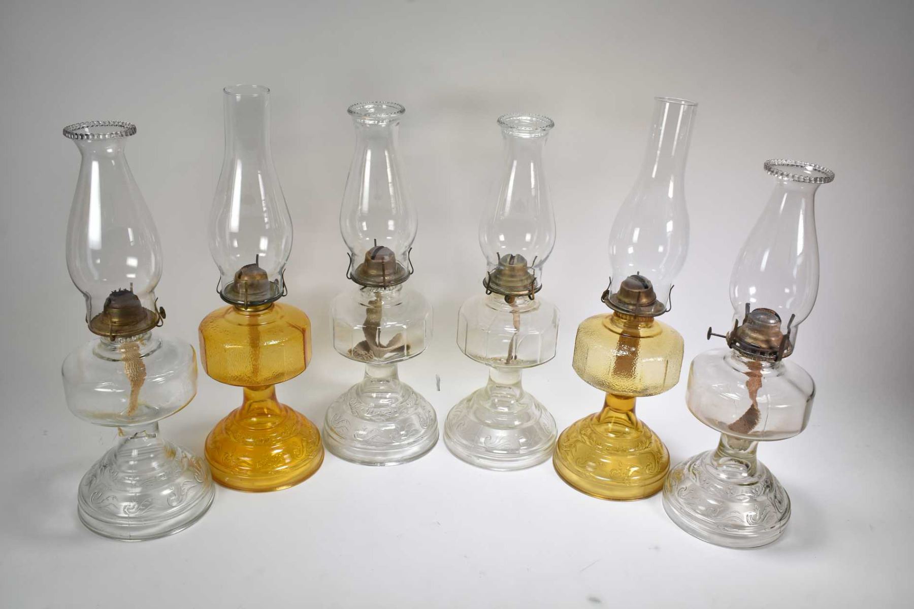 Three pairs of vintage glass oil lamps including two pairs of colourless and a pair of amber glass lamps all with hurricanes. Not available for shipping. Local pickup only