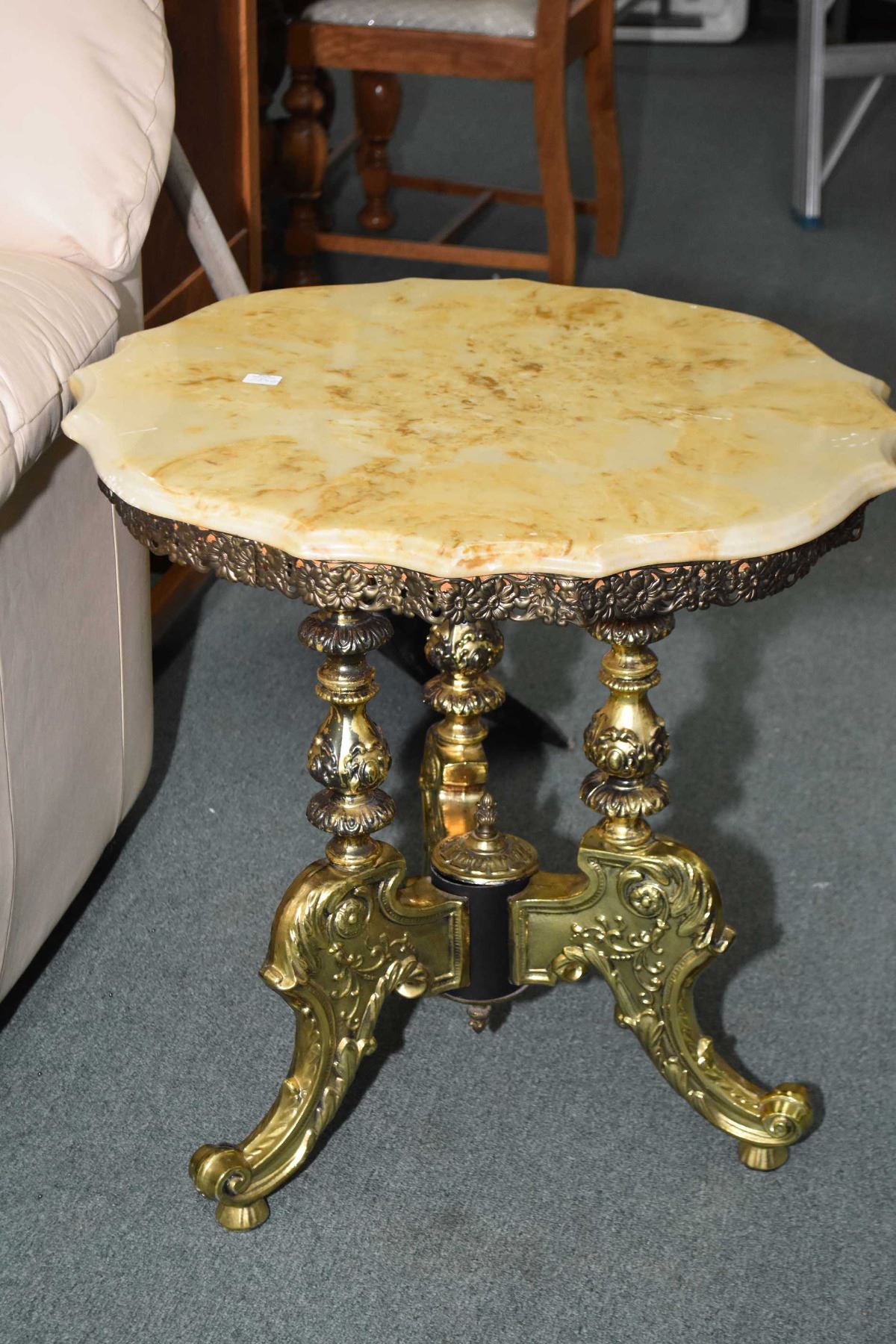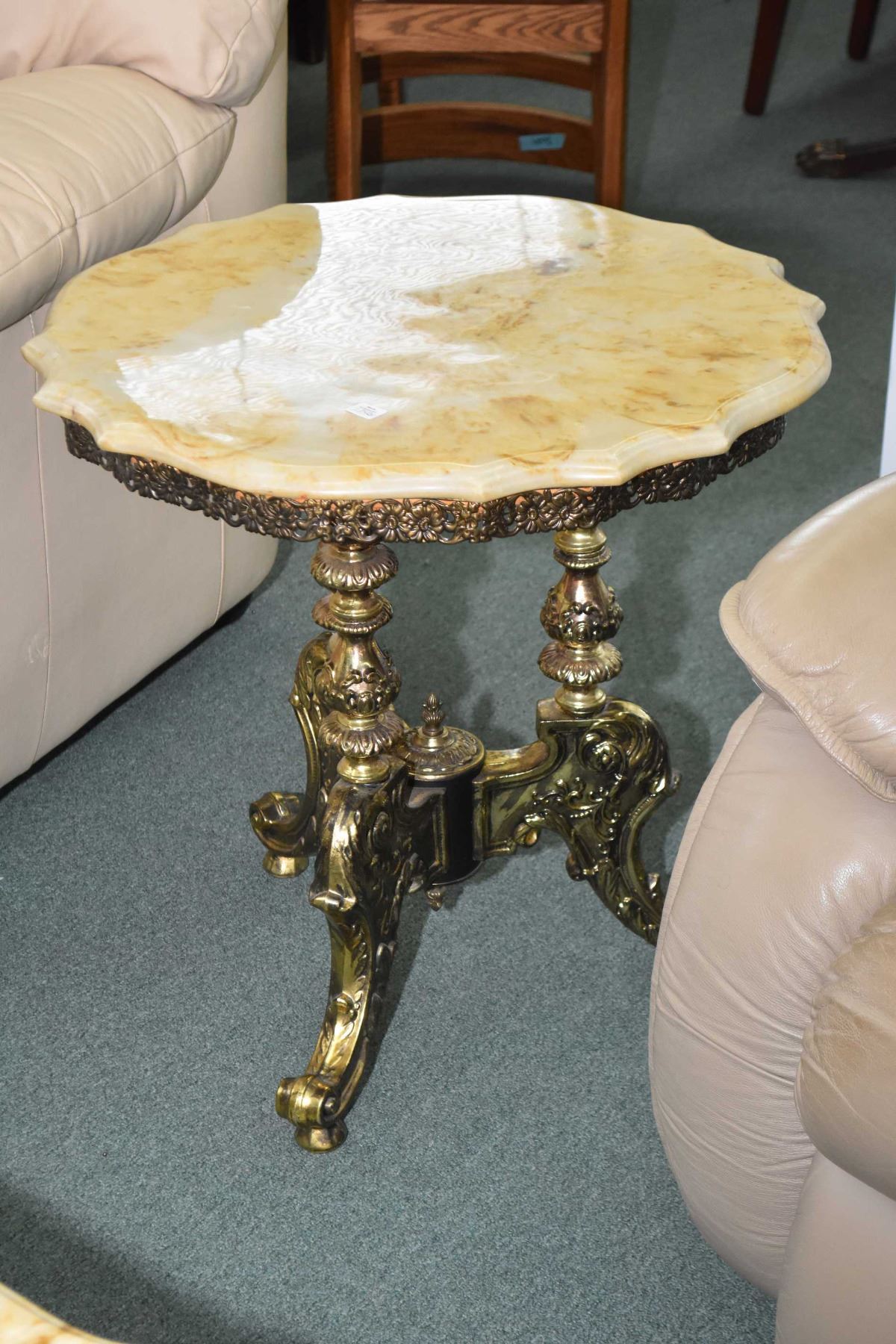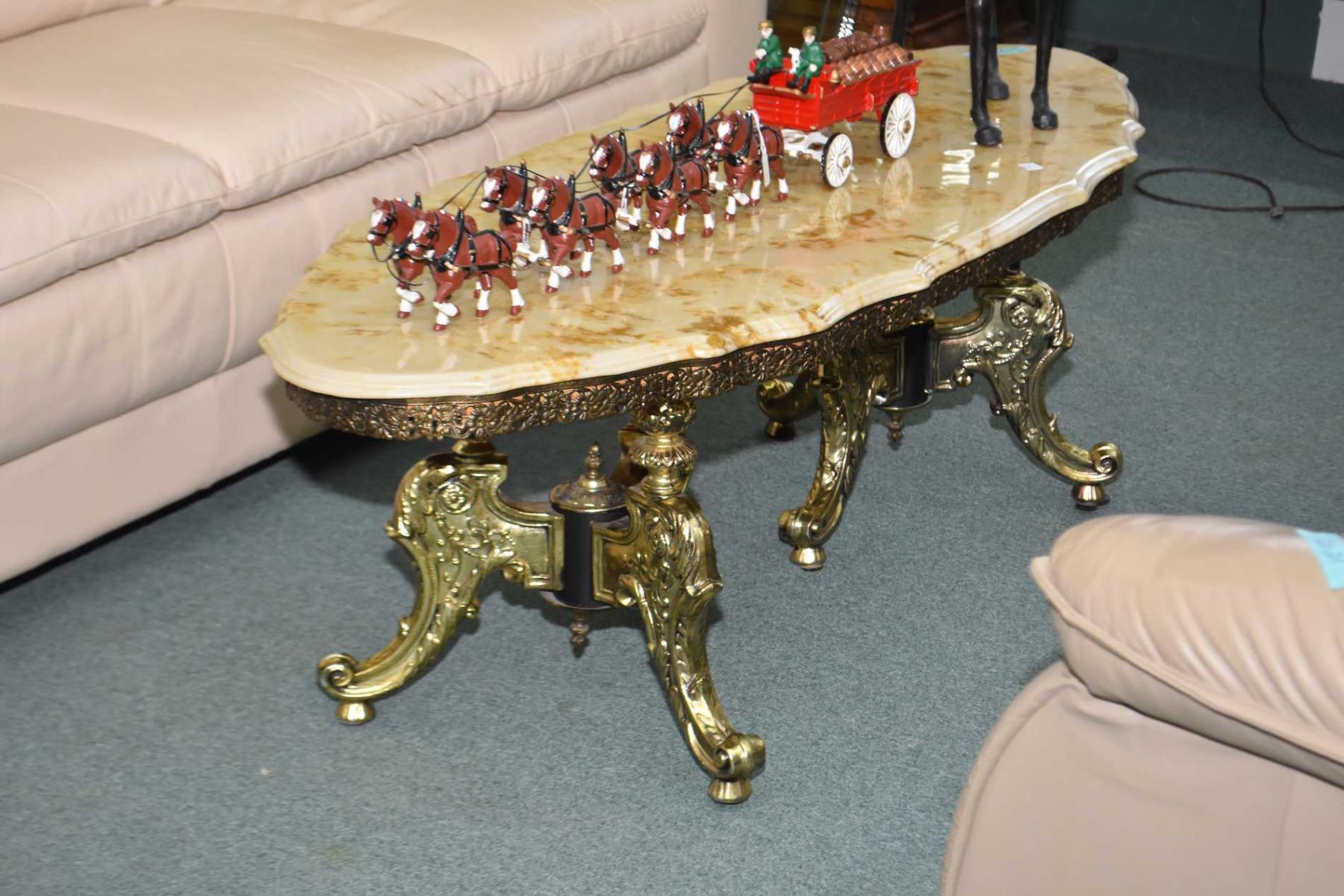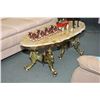 Three piece faux brass and marble parlour set including coffee table and a pair of end tables