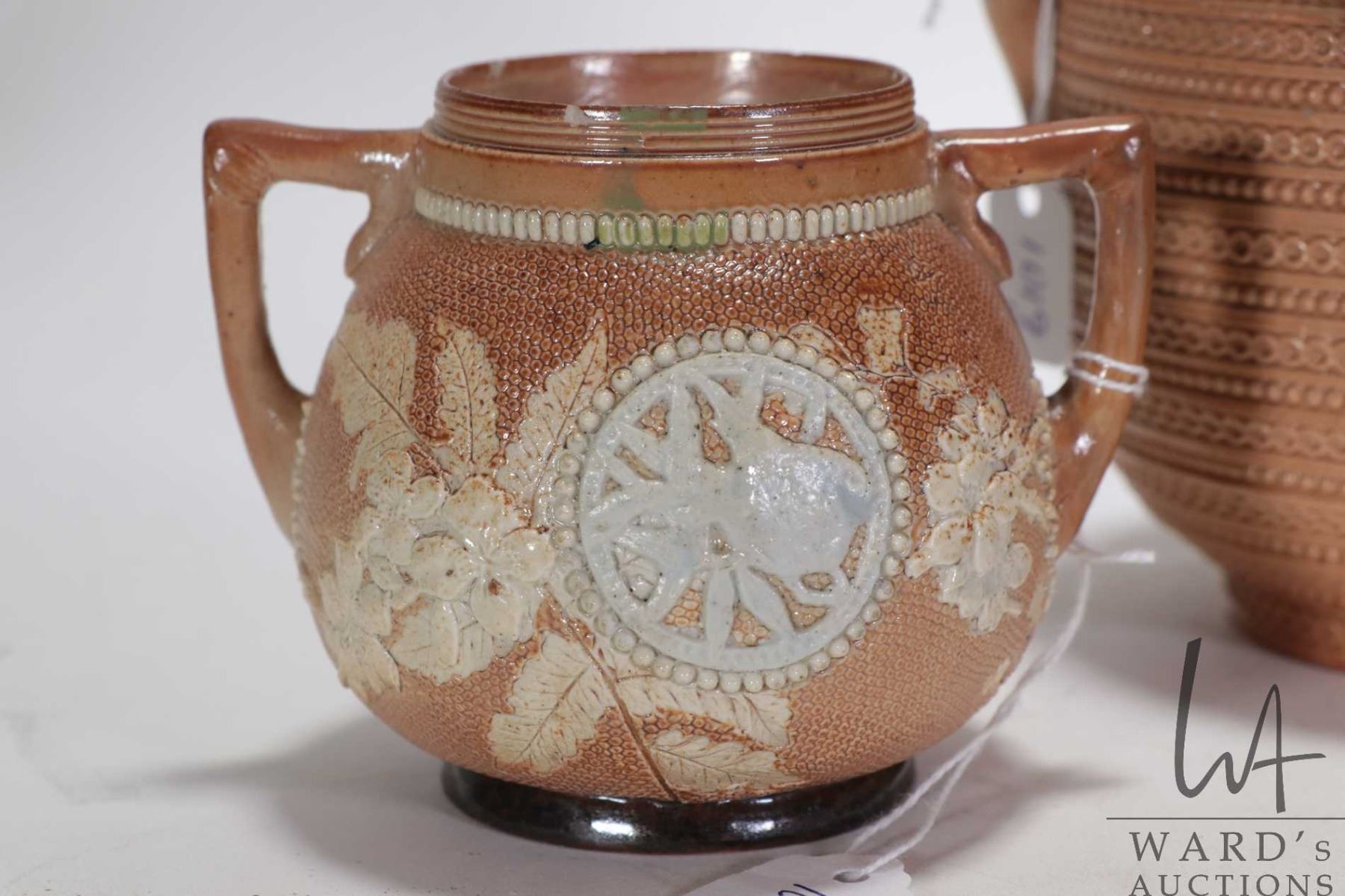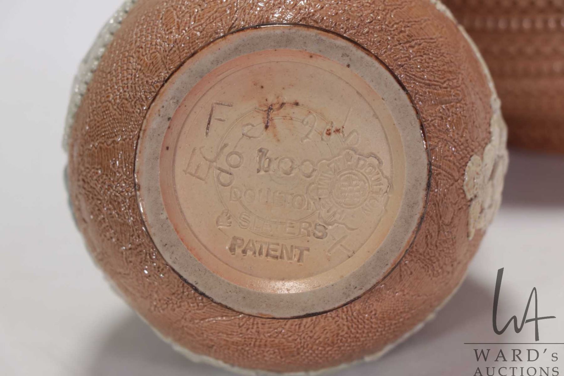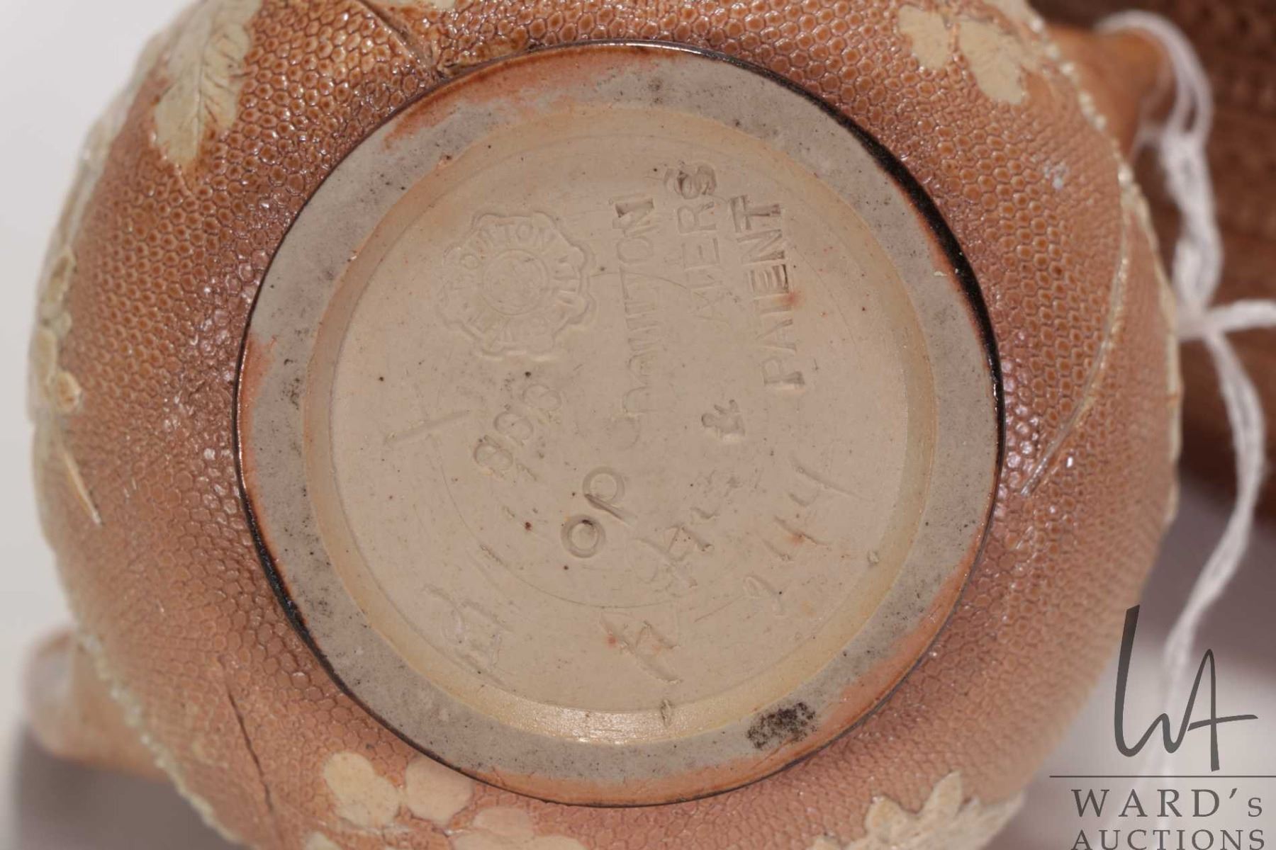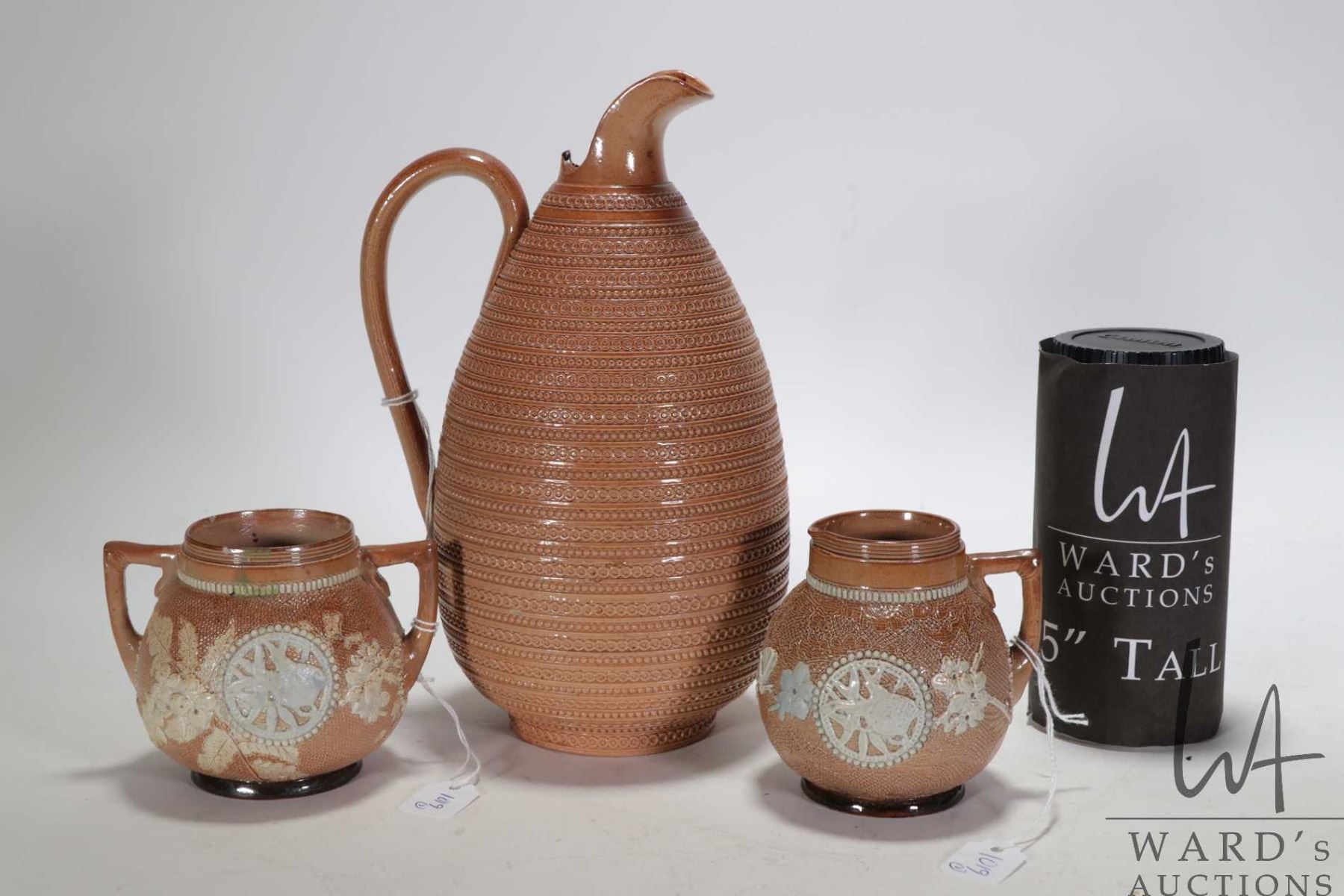 Three piece of antique Doulton Lambeth glazed including hand turned and decorated 9" ewer and Doulton Lambeth cream and double handled bowl, each with decorative birds, flower, fish and butterfly