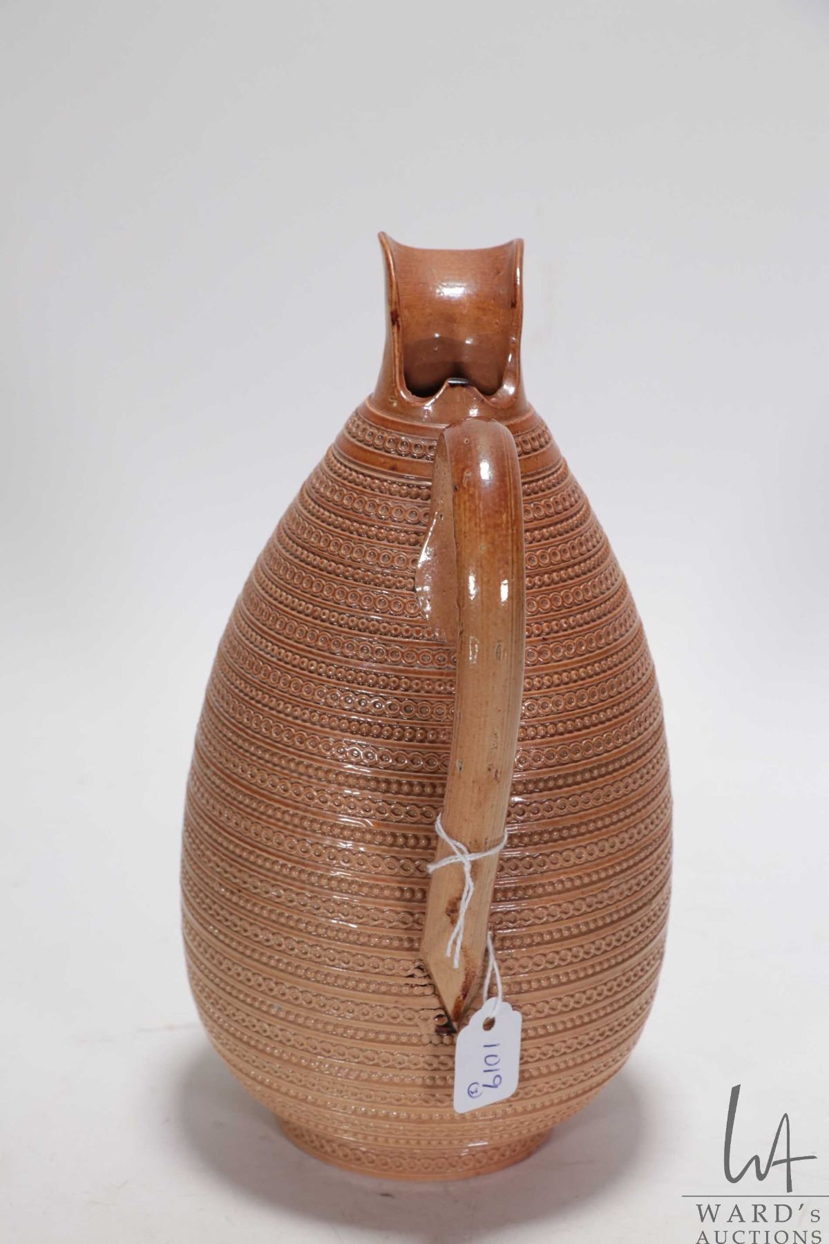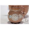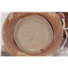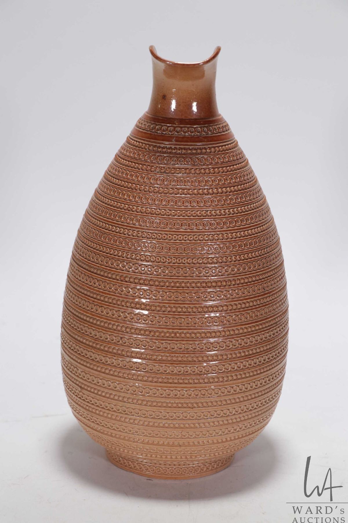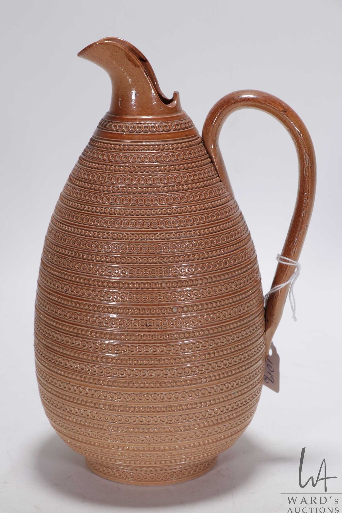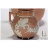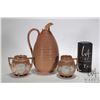 Three piece of antique Doulton Lambeth glazed including hand turned and decorated 9" ewer and Doulton Lambeth cream and double handled bowl, each with decorative birds, flower, fish and butterfly