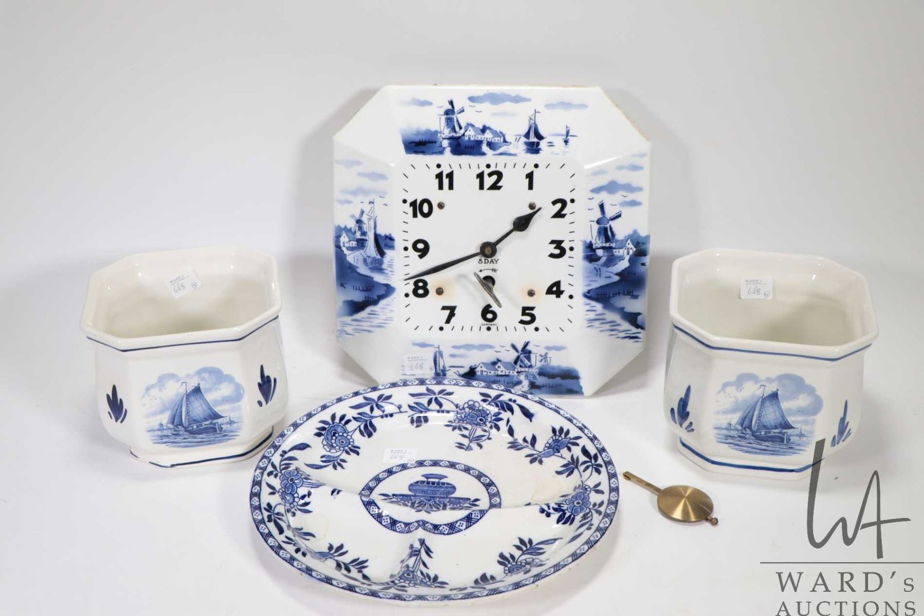 Three pieces of Delft pottery including a pair of matching hand painted and transfer ware planters, a 10 1/2" divided dish and a German made wall clock