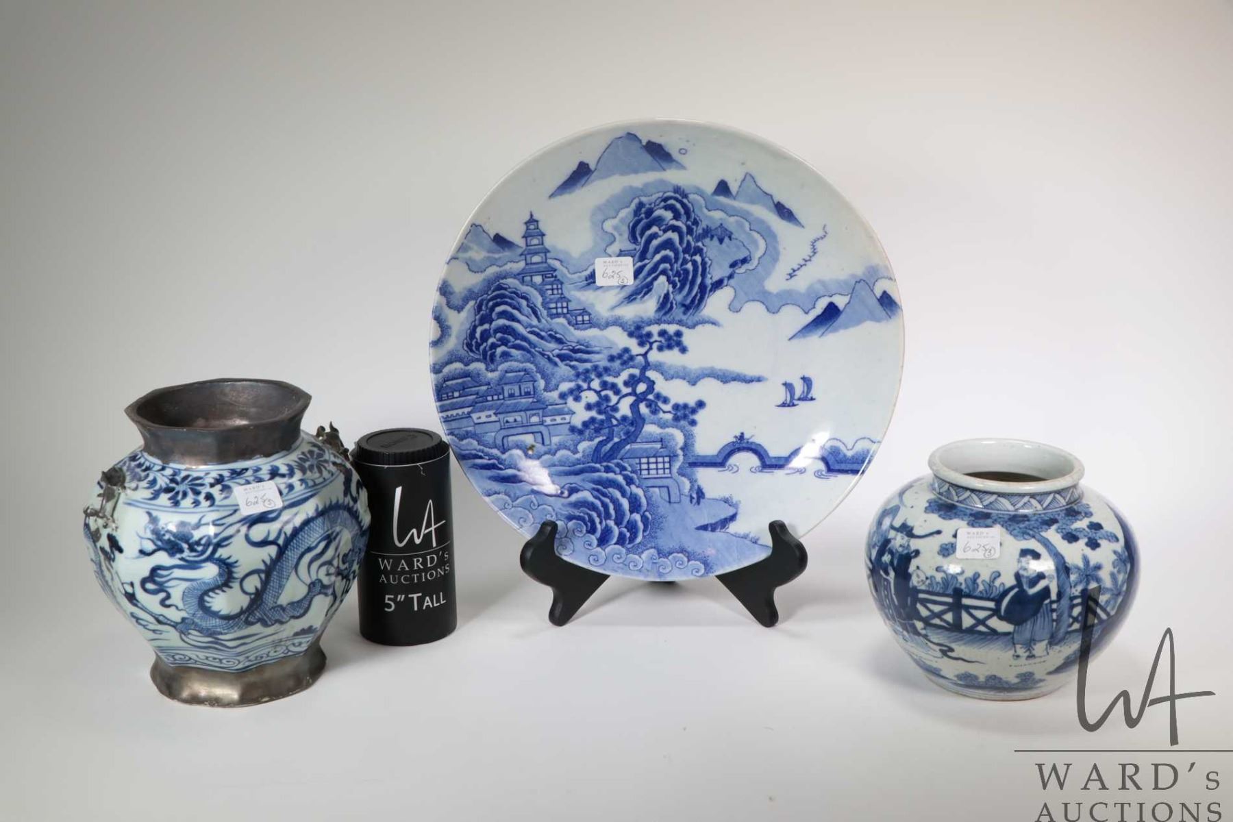 Three pieces of Oriental blue and white pottery including 12" charger, dragon motif bowl with applied dragon handles and a figural garden scene vase. Note: Not available for shipping. Local pickup only