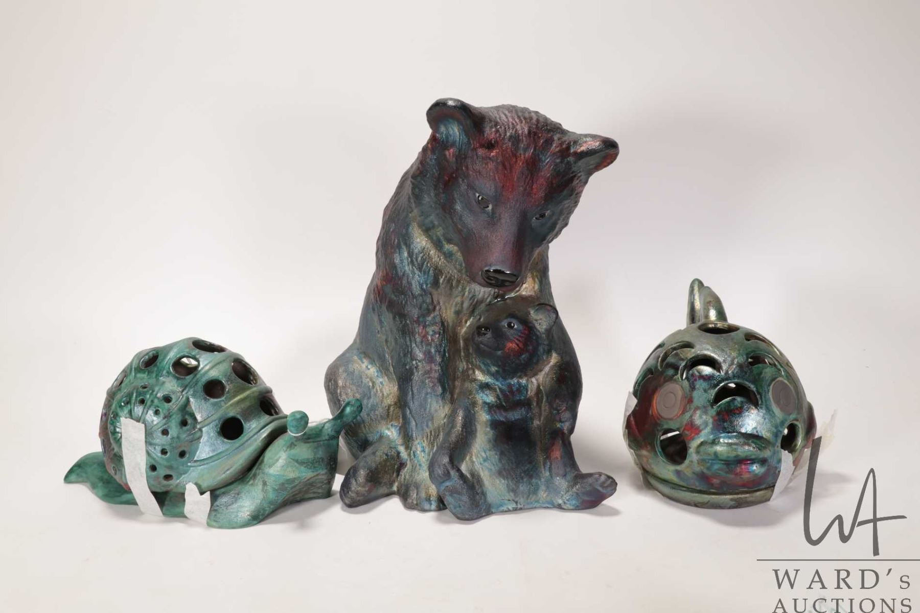 Three pieces of Raku fired ceramics including a 10" mother bear and cub, a gold fish butter dish and a snail butter dish