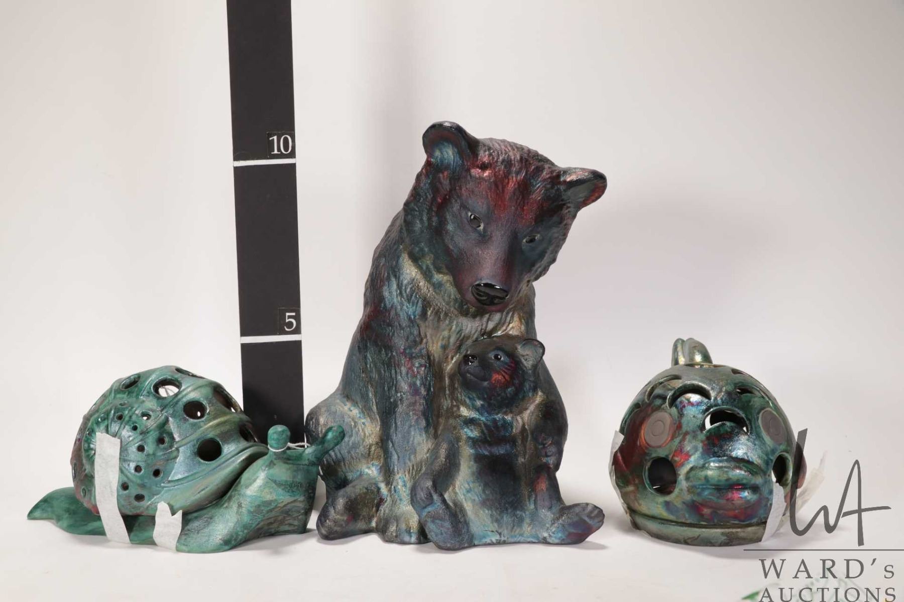 Three pieces of Raku fired ceramics including a 10" mother bear and cub, a gold fish butter dish and