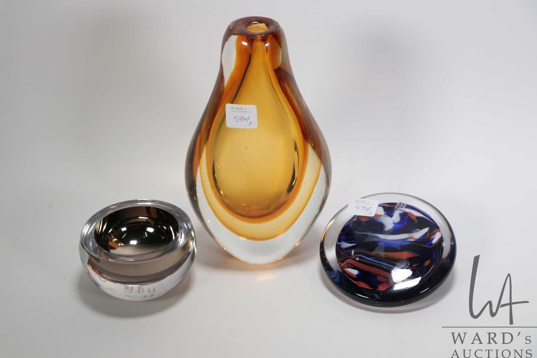 Three pieces of art glass including MDINA GLASS paperweight, LSA International dish 2 1/4" in height and a 8 1/4" heavy unmarked vase