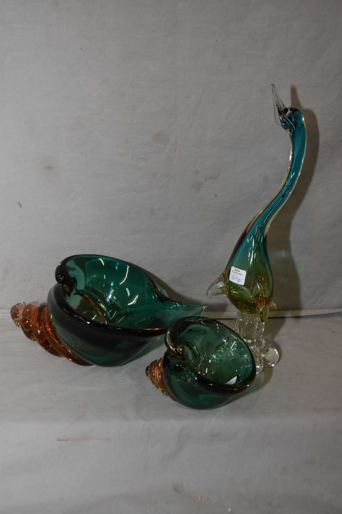 Three pieces of art glass including sea shells and a co-ordinating 15  bird
