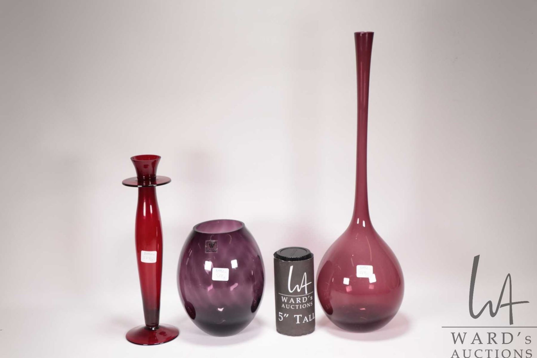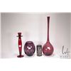 Three pieces of collectible art glass including amethyst Royal Art Glass vase, 19" amethyst vase and a 12" ruby glass candle stick