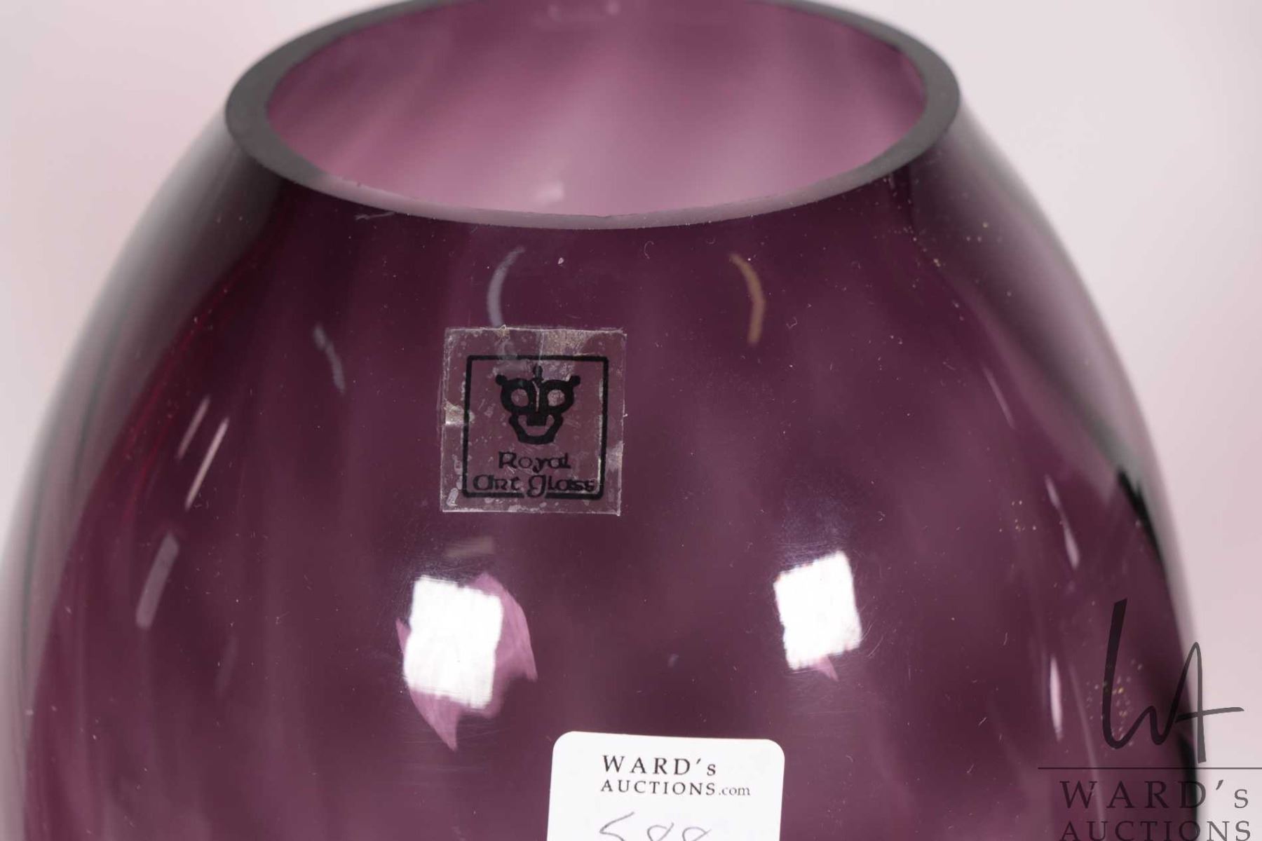 Three pieces of collectible art glass including amethyst Royal Art Glass vase, 19" amethyst vase and