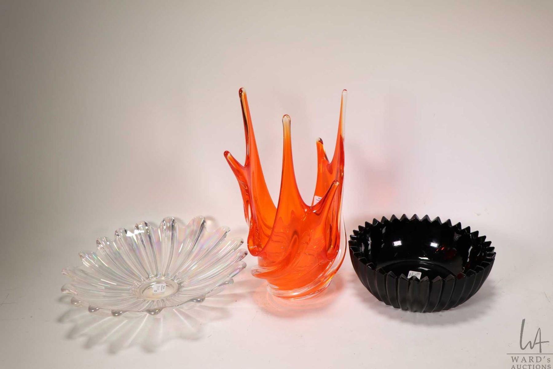 Three pieces of collectible glass including 12" signed Chalet art glass dish, a iridescent glass scalloped plate and a black glass dish
