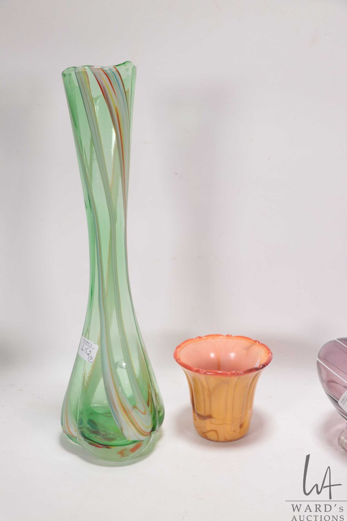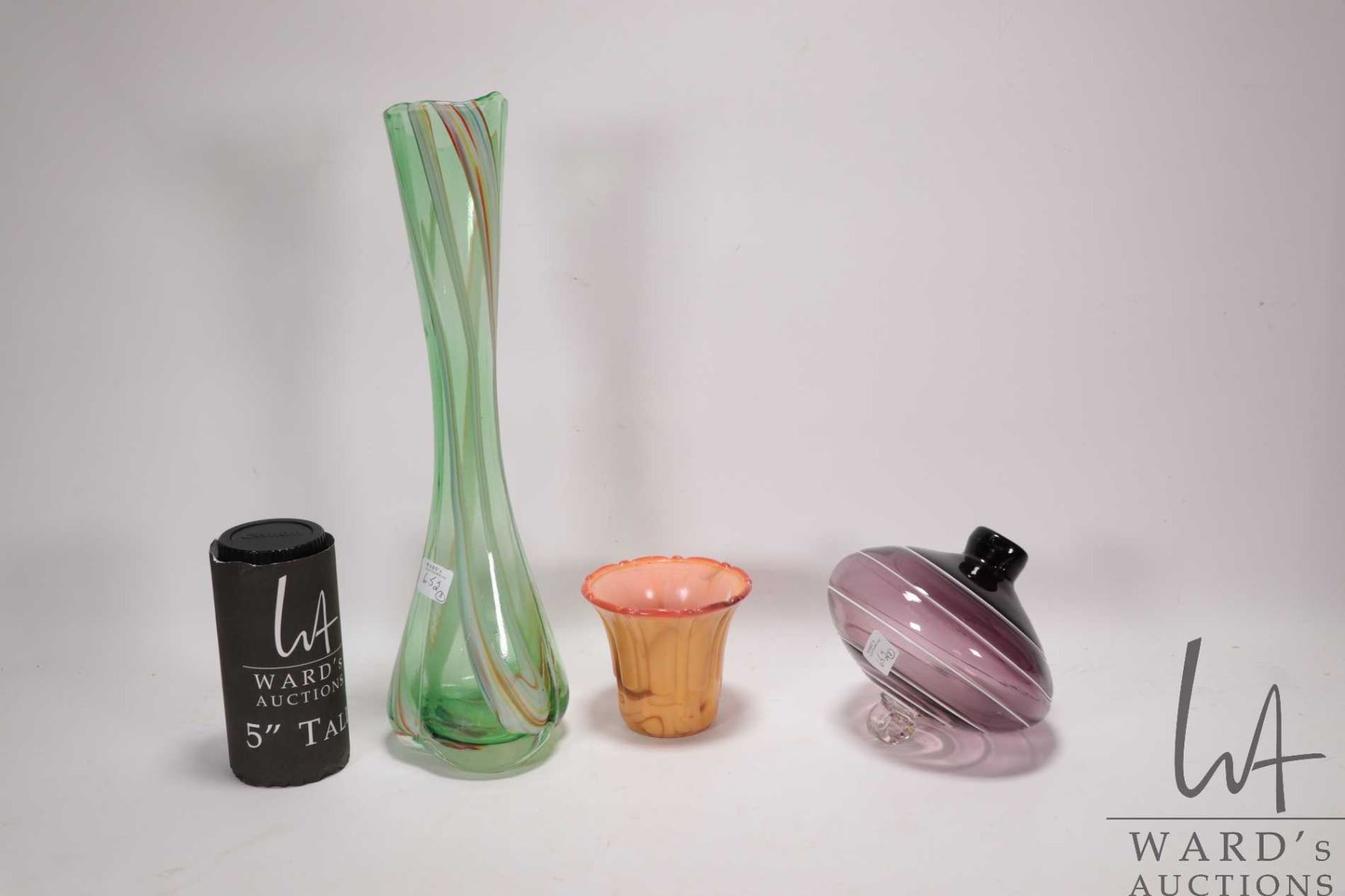 Three pieces of collectible glass including vintage 1940's Akro Agate slag glass beaker, 14" high cased glass green vase etc.