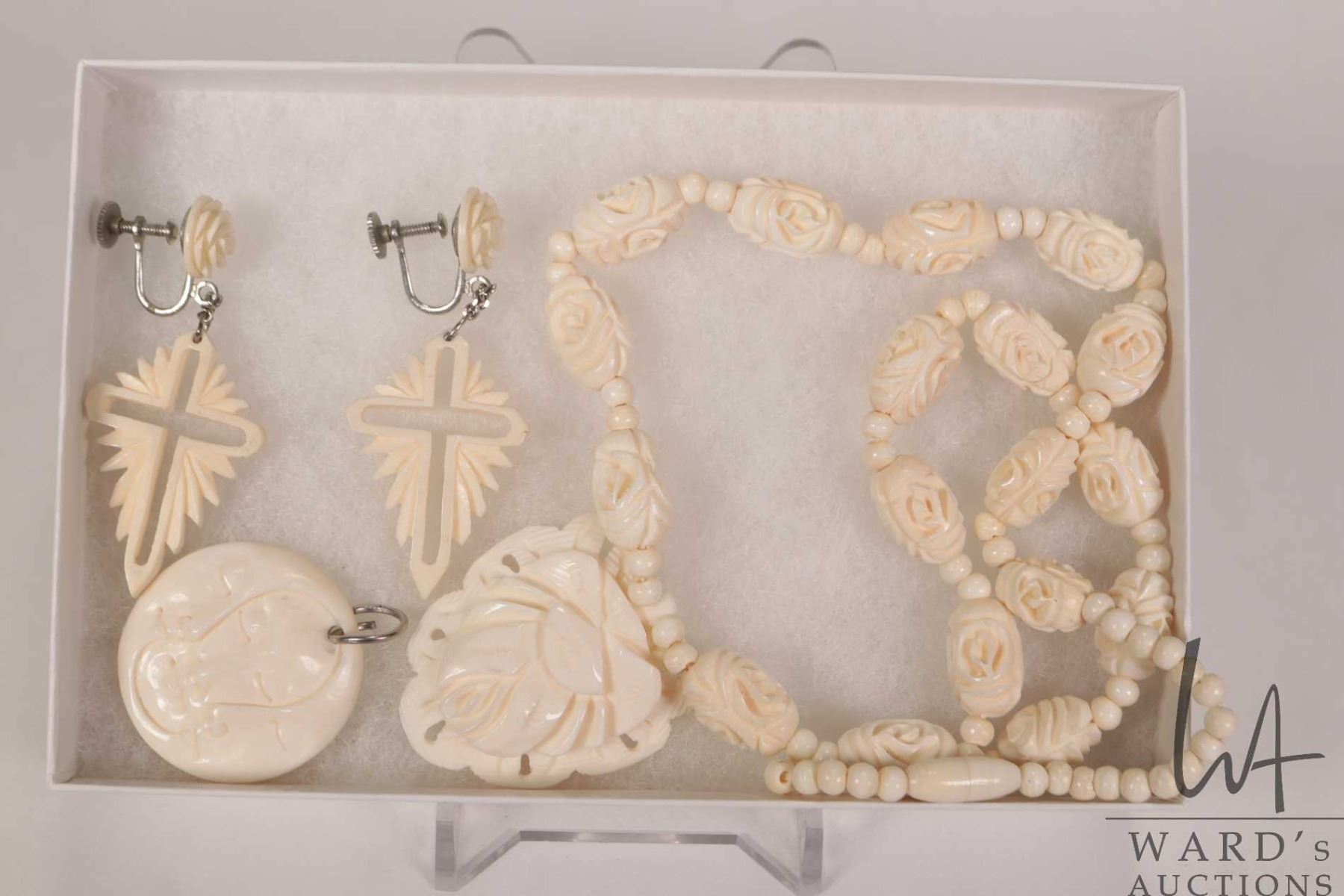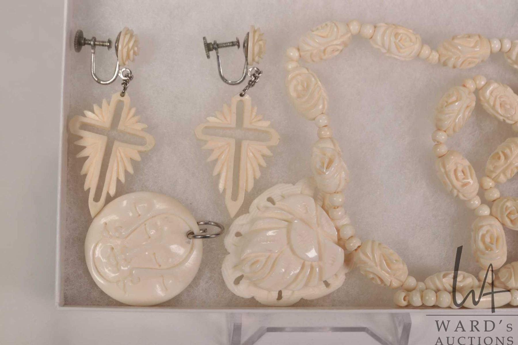 Three pieces of hand carved jewellery including 18" carved beaded necklace with pendant, a pair of e