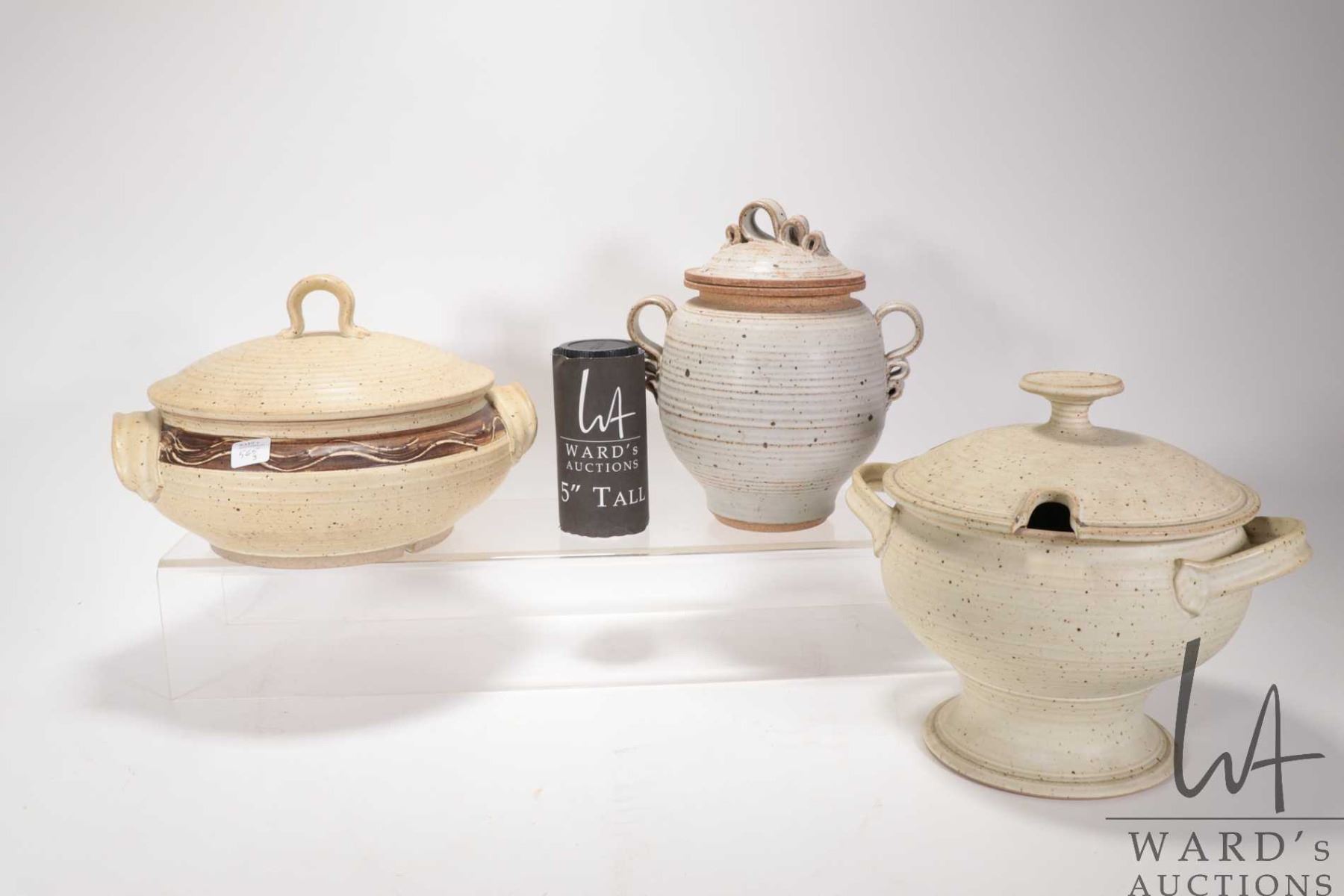 Three pieces of handmade pottery including pedestal tureen plus double handled casserole and biscuit barrel both marked Falkins