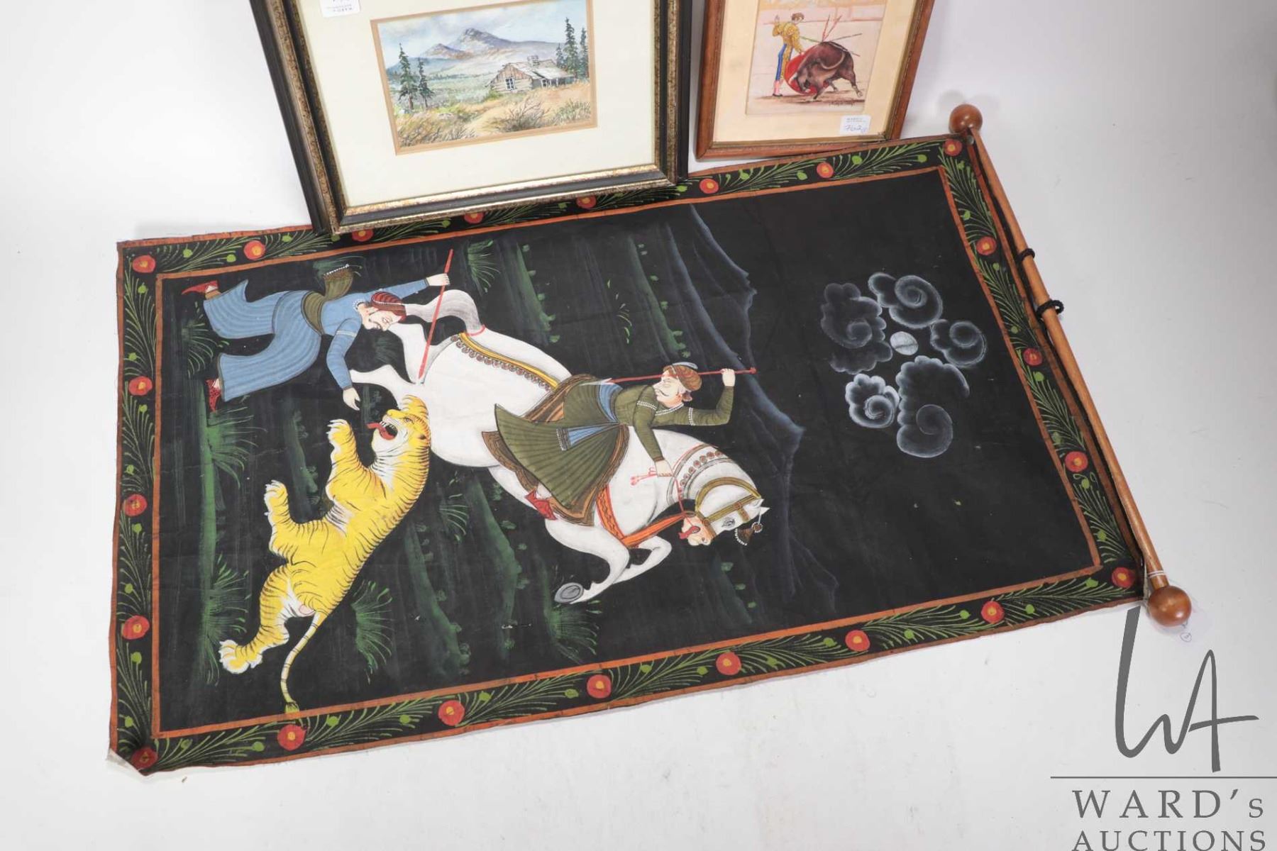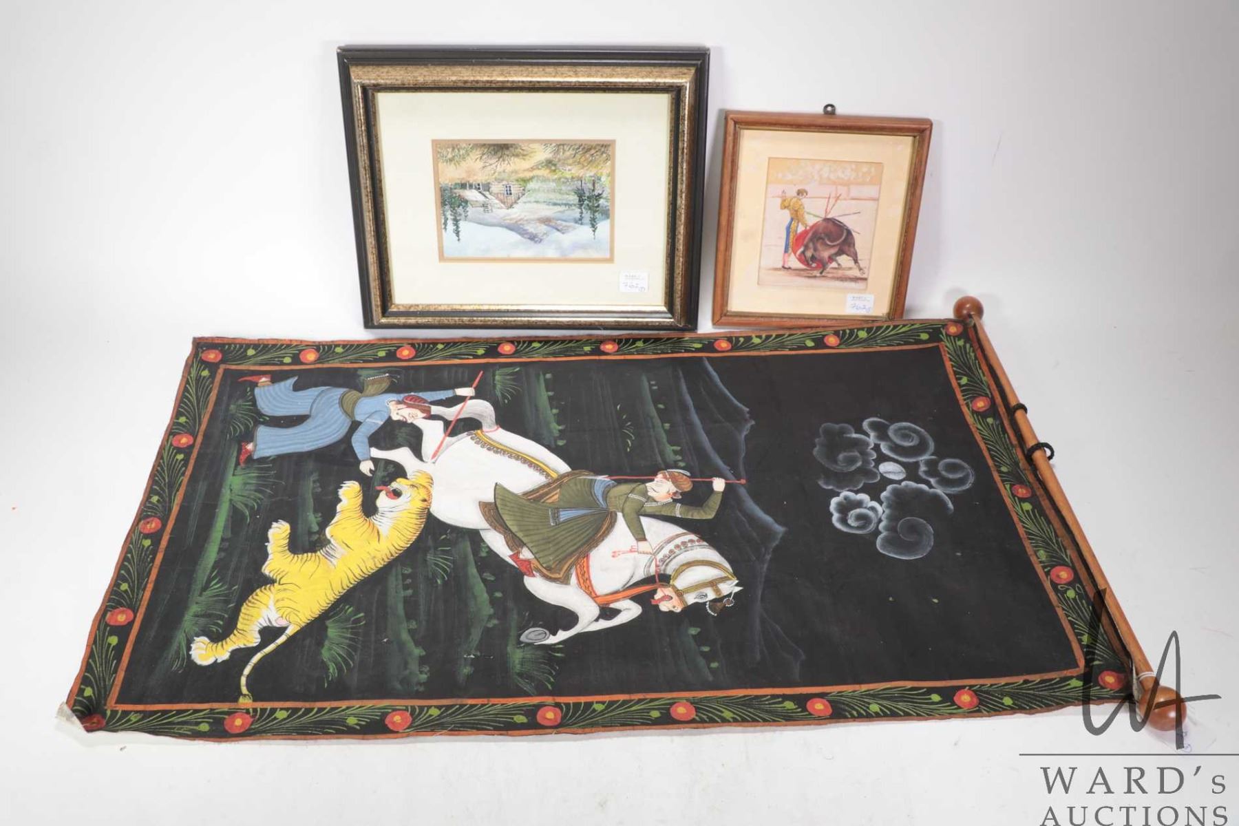 Three pieces of original artwork including Joaquin Eleazar watercolour on board painting of a bullfighter and bull 5" X 4", a J. Blair watercolour painting of a mountain cabin, 4 1/2" X 6" and a Indo-Persian painting of Maharajah hunting a tiger, 27" X 16 3/4"