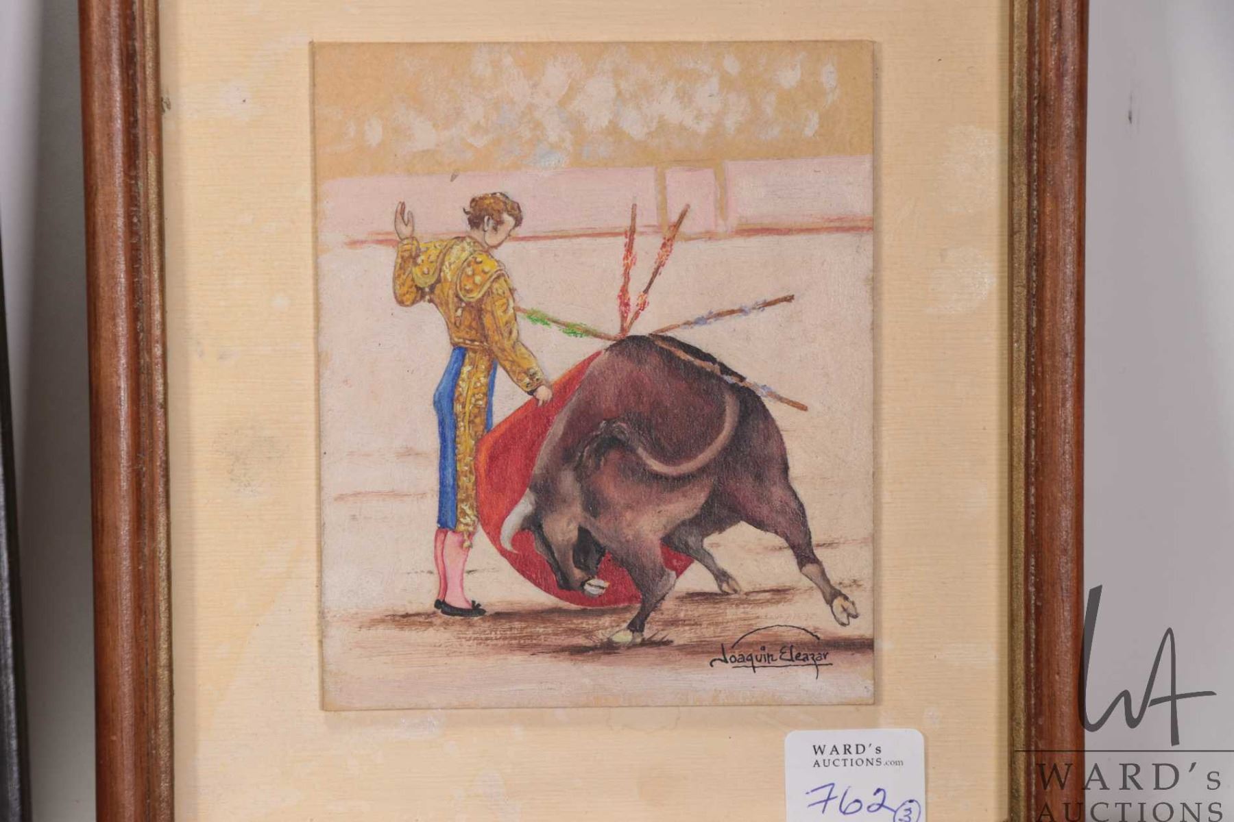 Three pieces of original artwork including Joaquin Eleazar watercolour on board painting of a bullfi