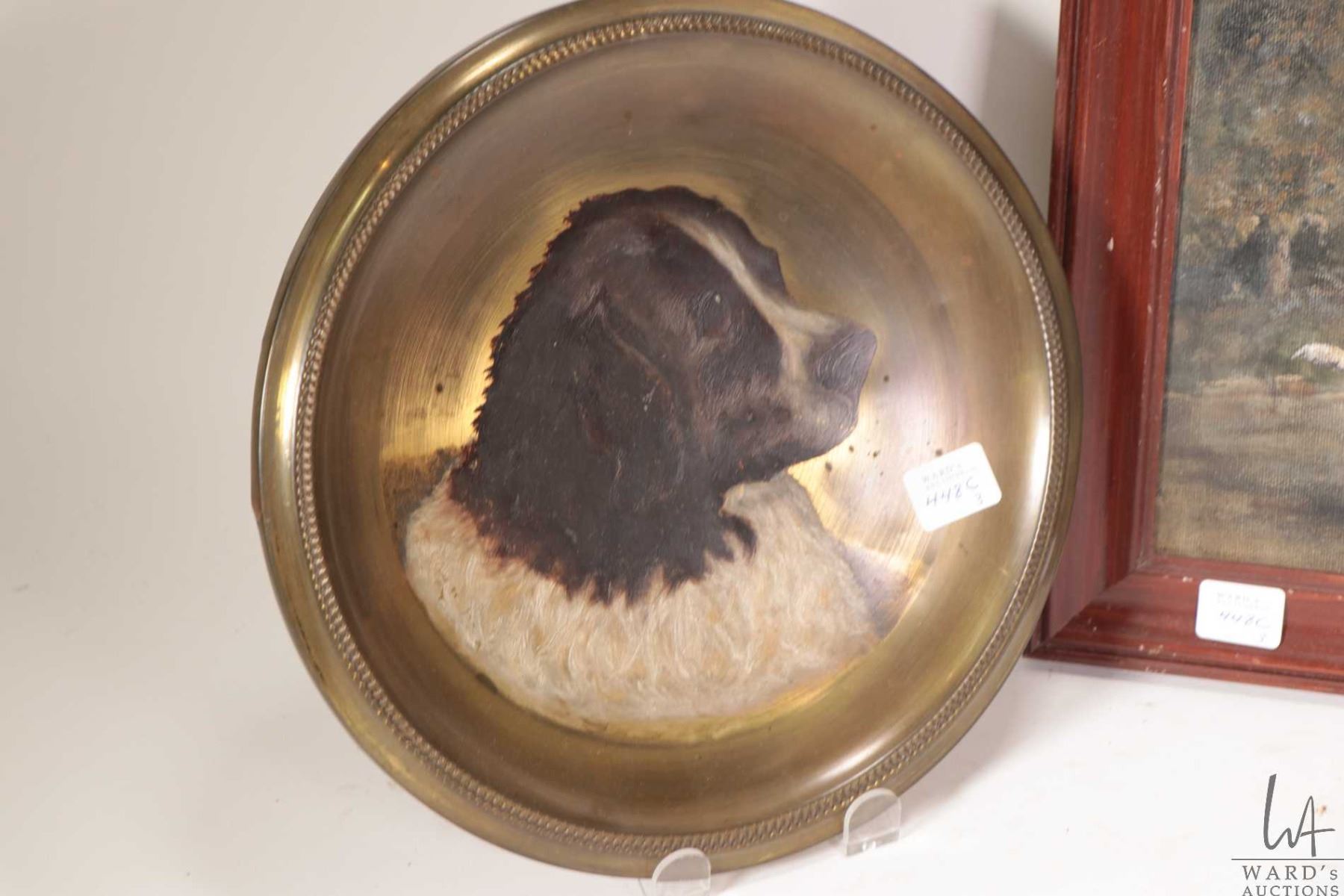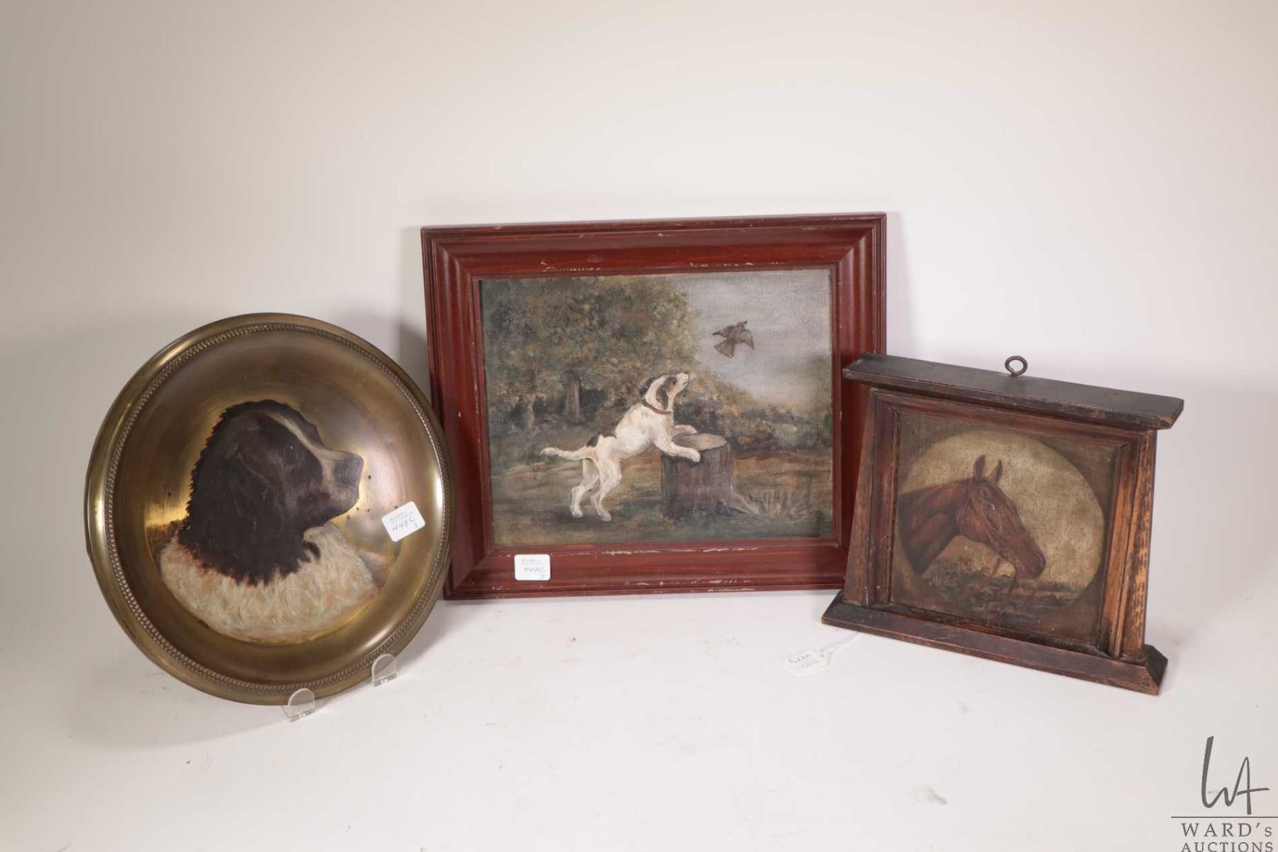 Three pieces of original artwork including dog portrait on brass tray, horse in deco style oak frame and a playful pup and bird in picture frame