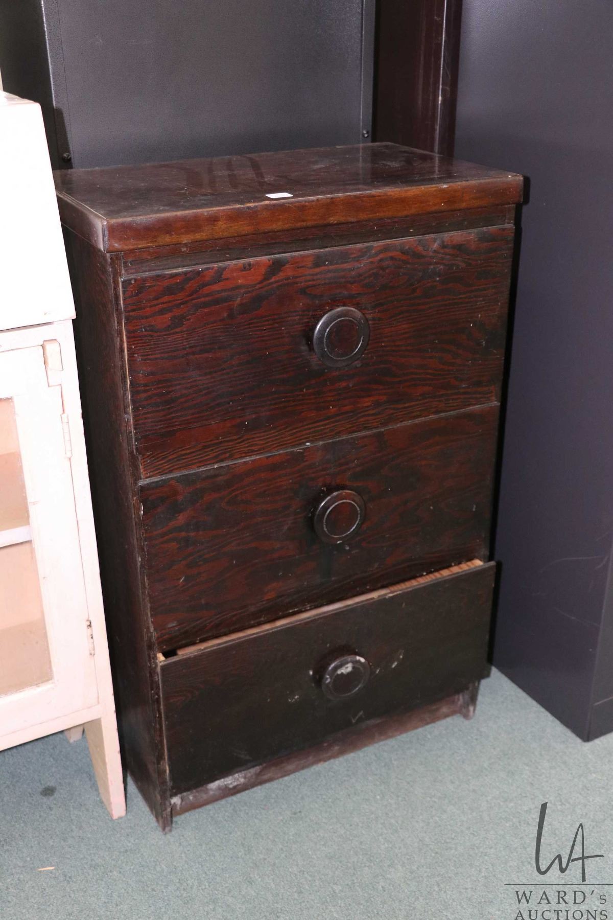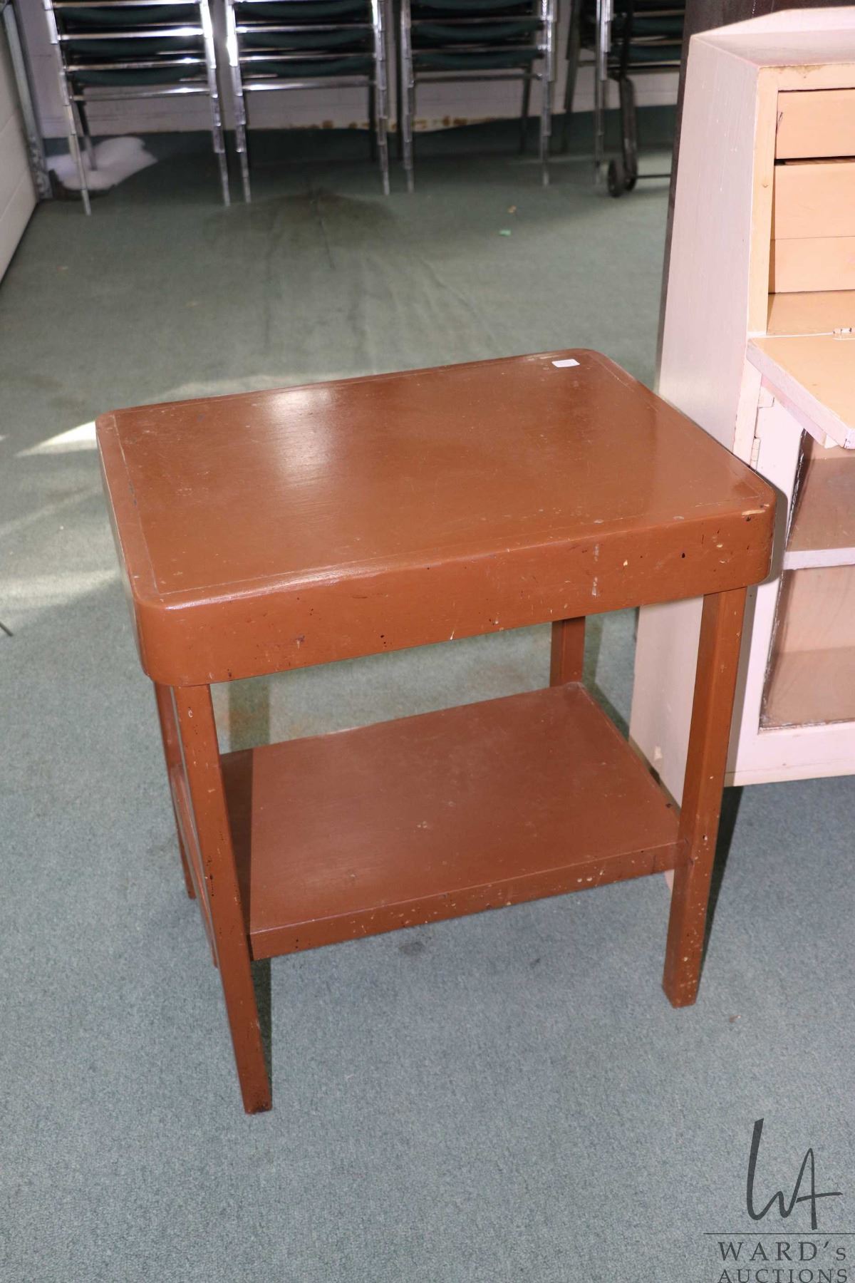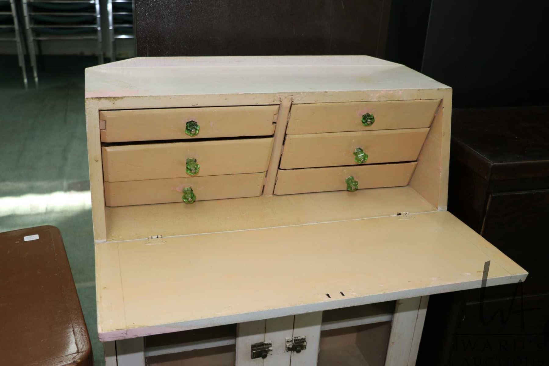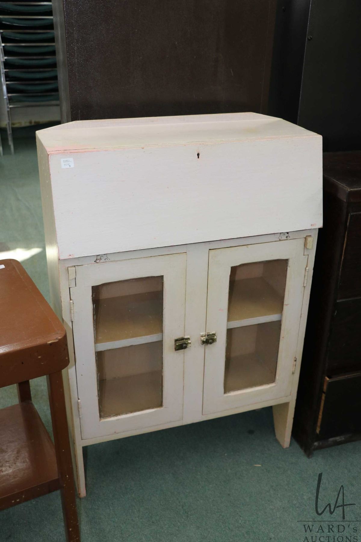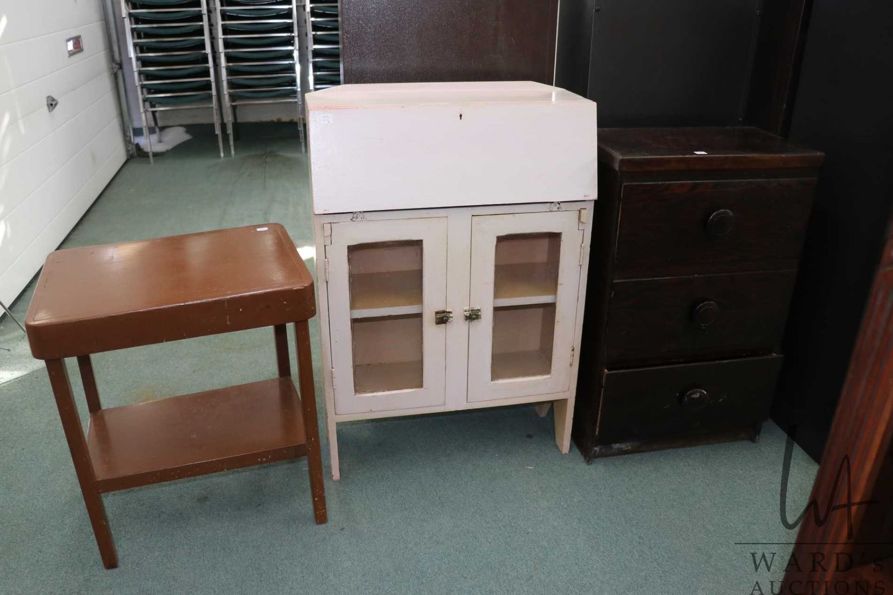 Three pieces of small furniture including painted side table, painted child sized fall front desk and a shop made three drawer chest 32" H X 21" W X 12" D