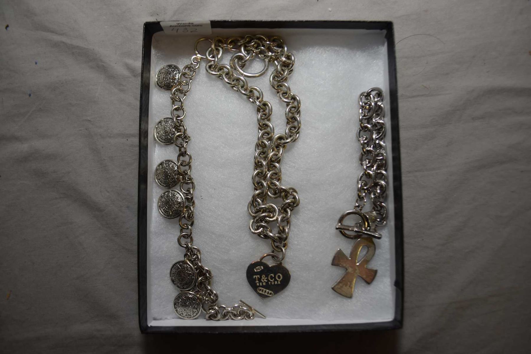 Three pieces of sterling silver jewellery including two bracelets and 16" necklace with pendant with Tiffany & Co. logo