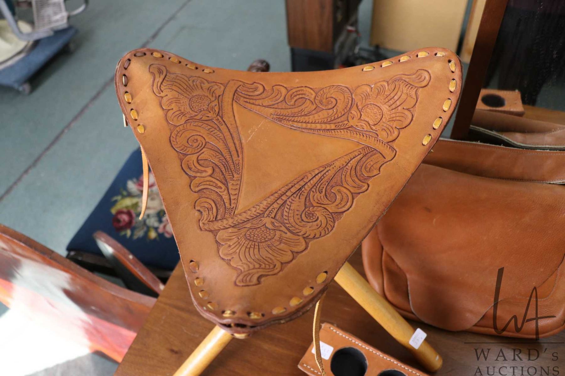 Three pieces of tourist leather work including folding bench with tooled seat, shoulder satchel and