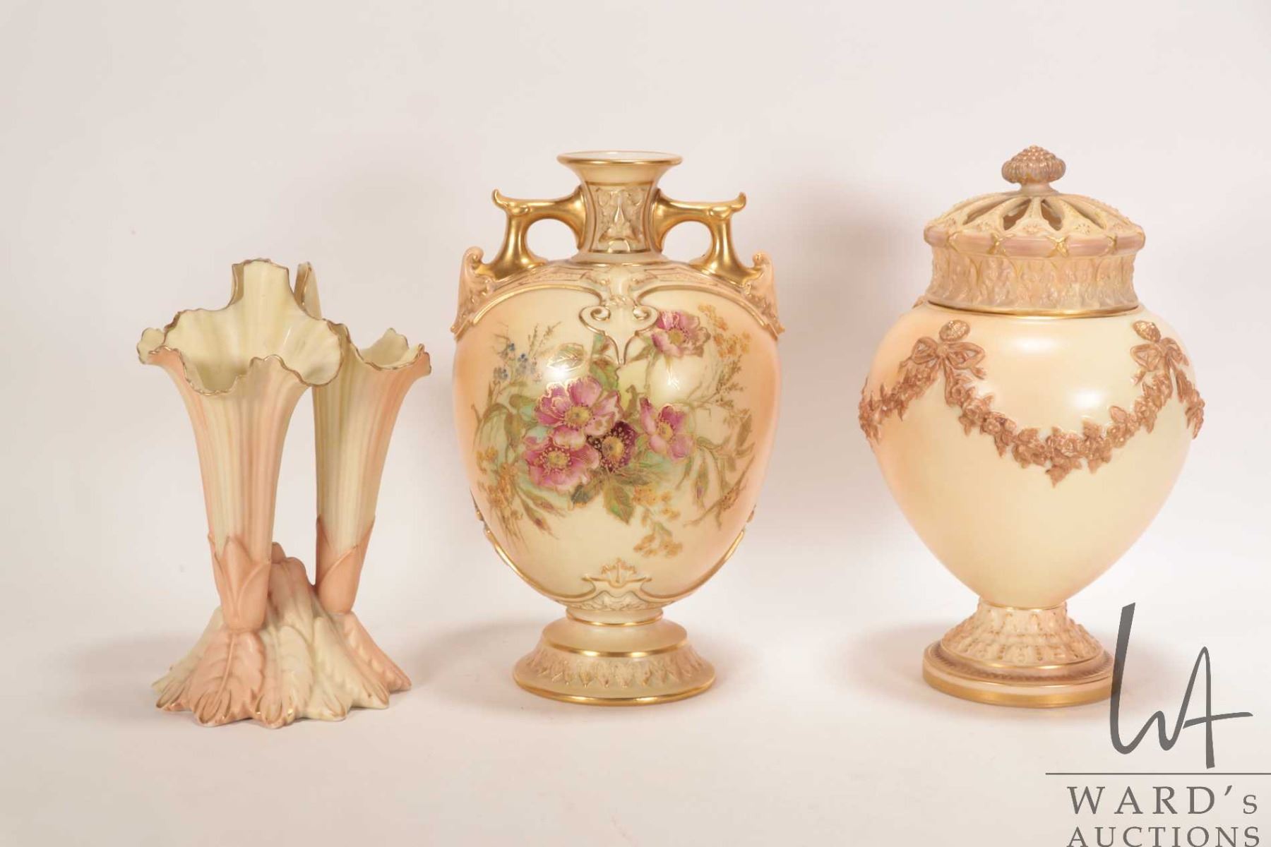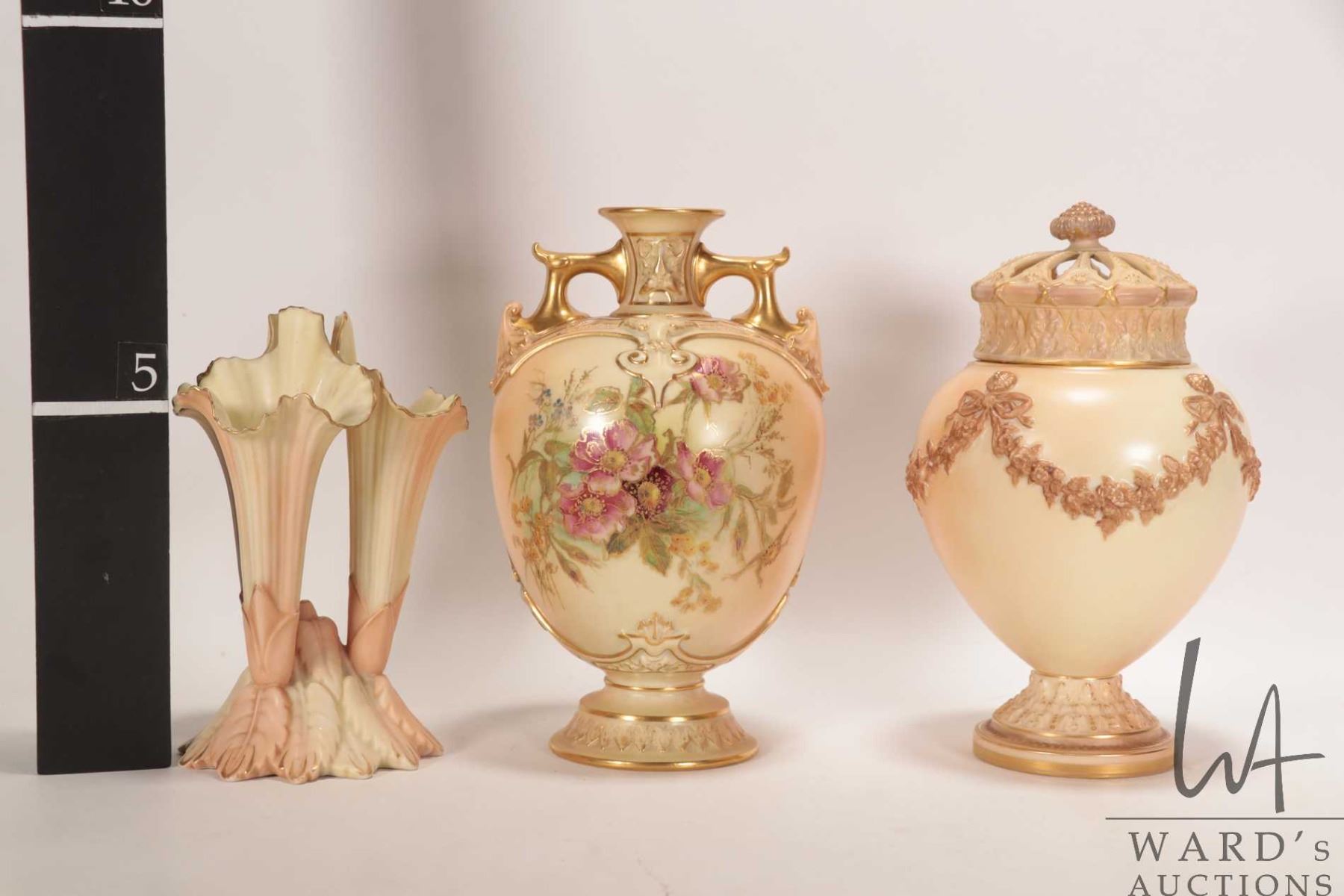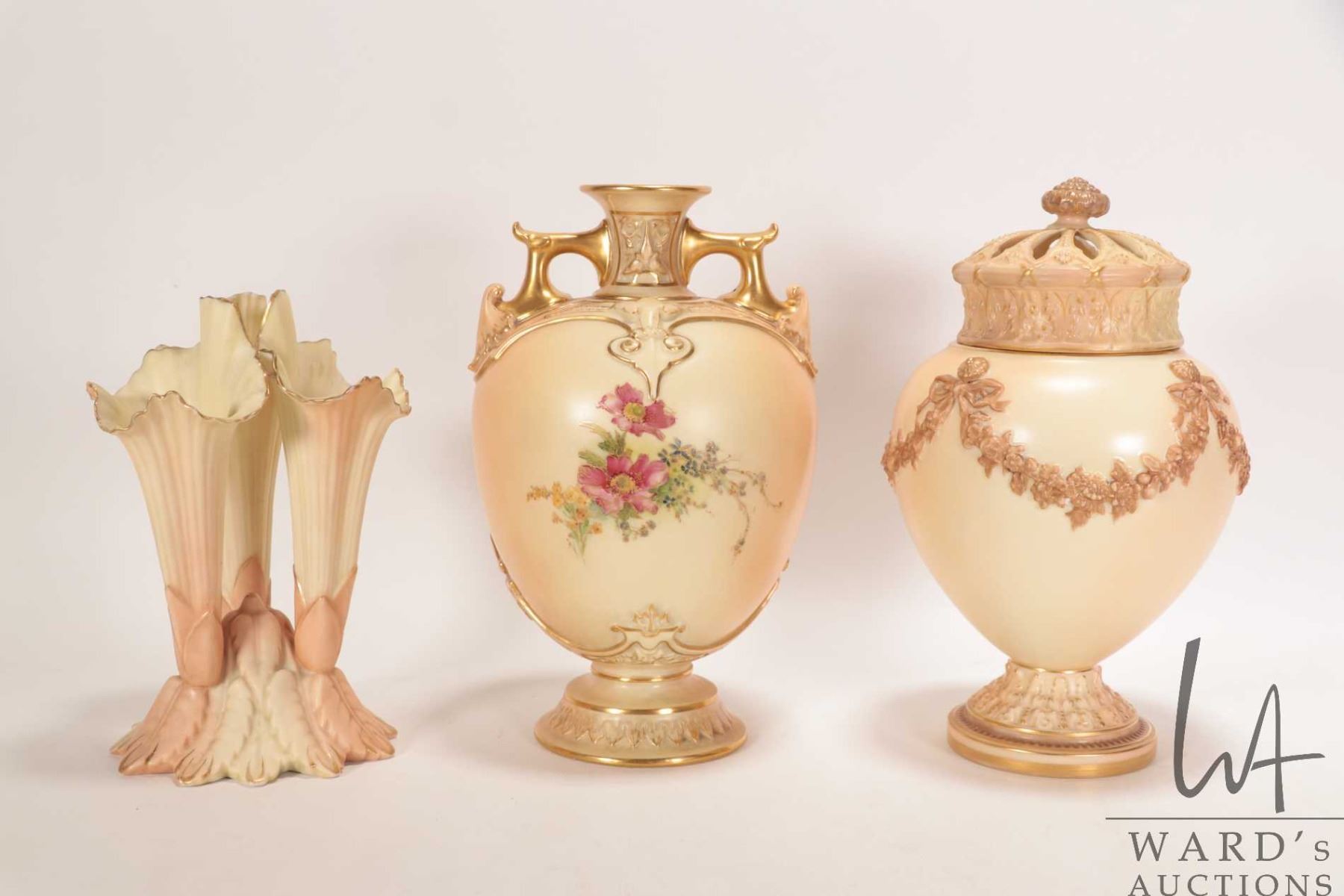 Three pieces of vintage/ antique Royal Worcester blush ivory including 8" vase with handpainted flowers, lidded potpourri and a triple fluted bud vase