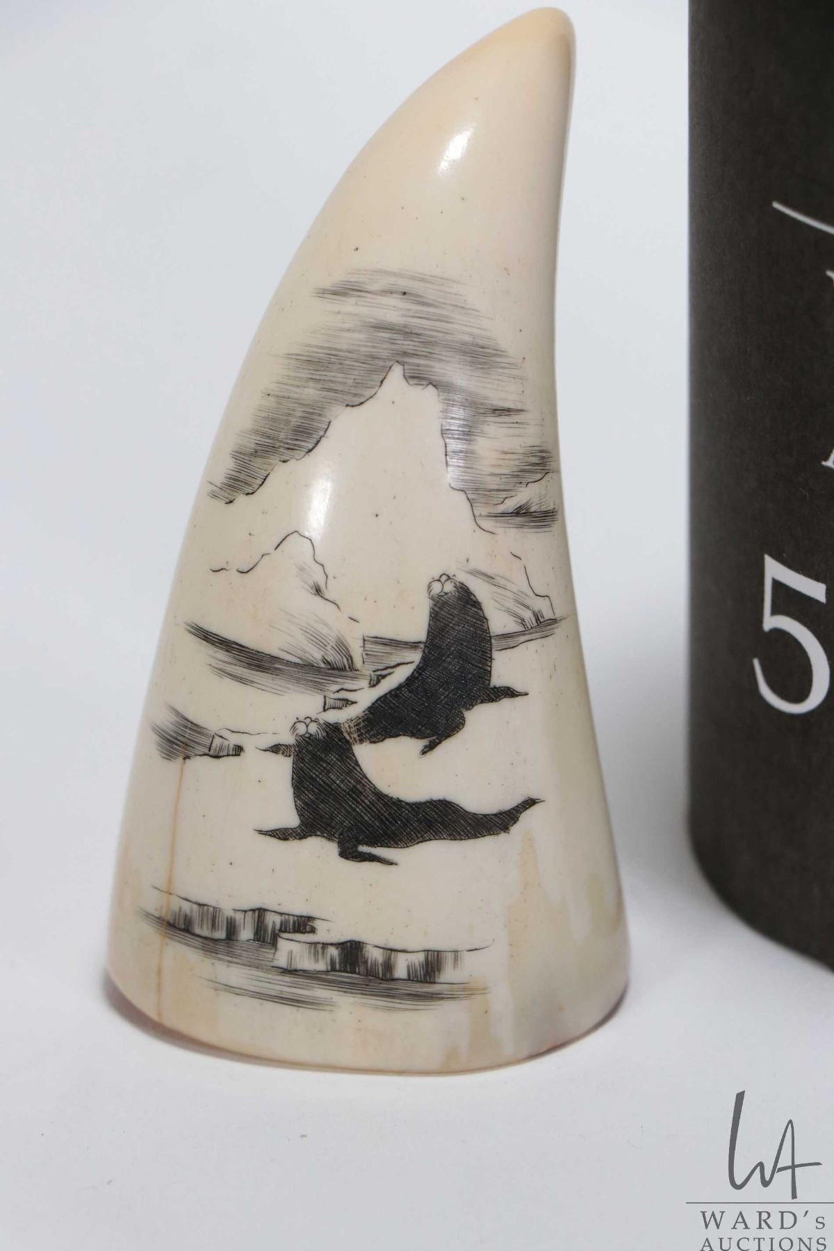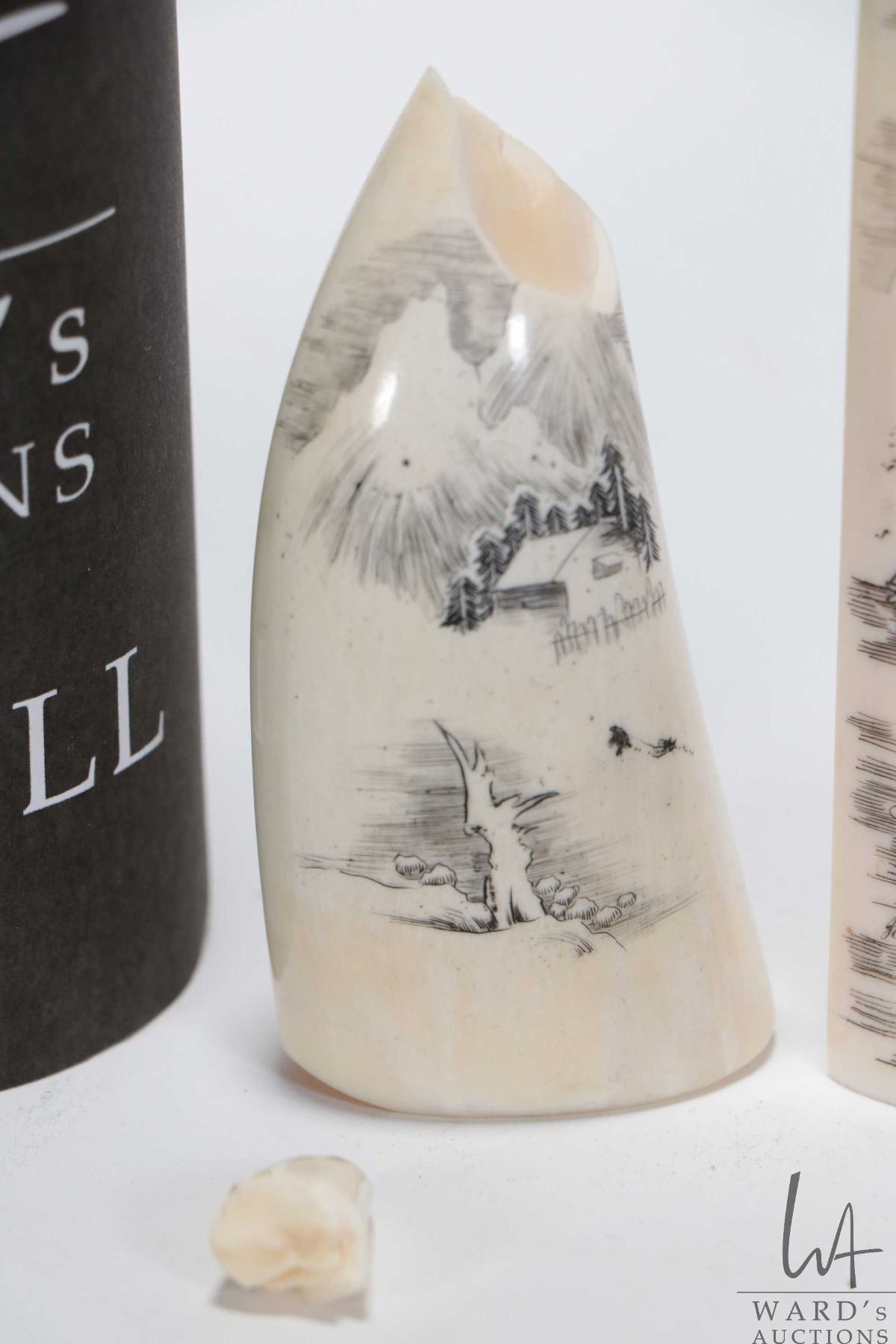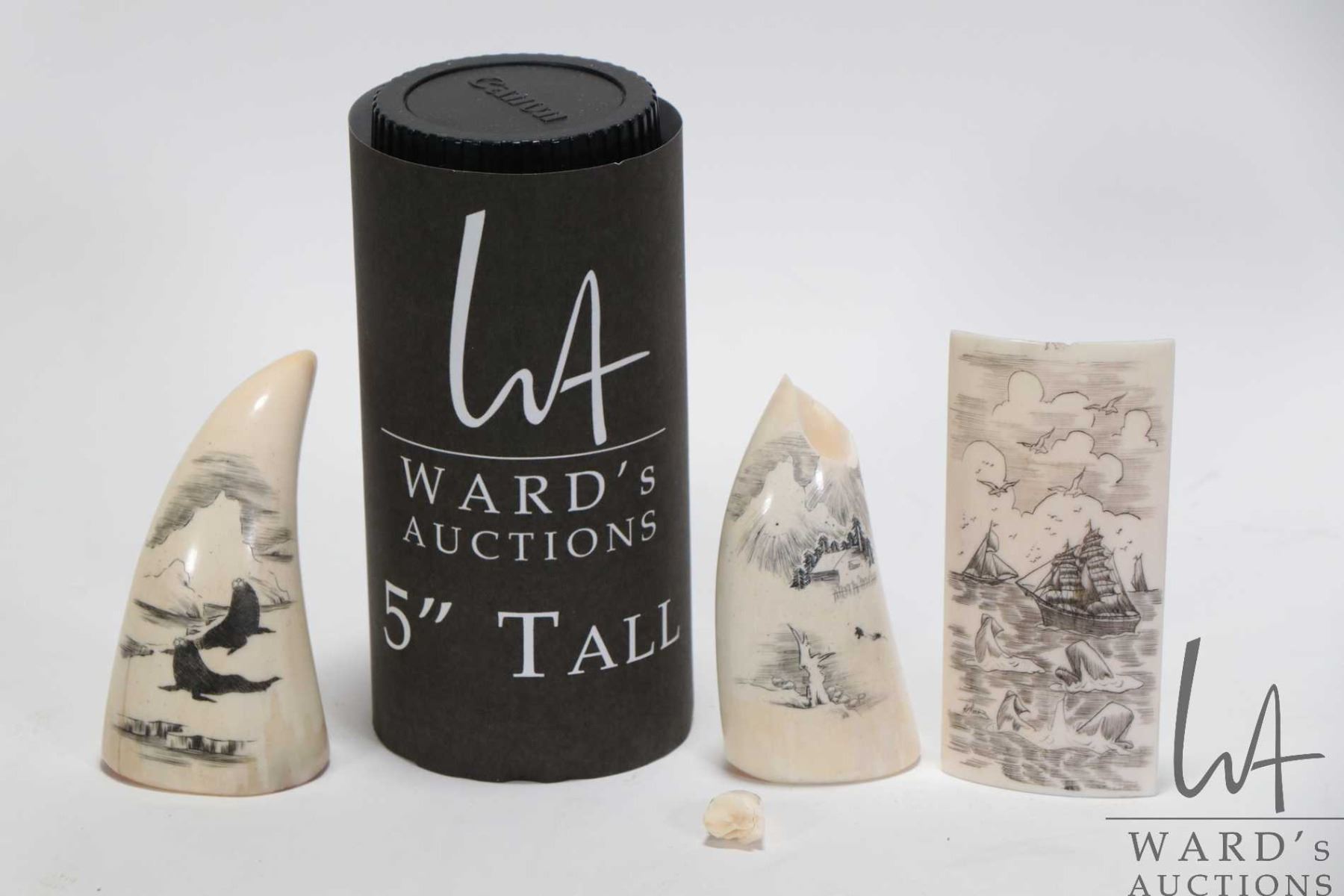 Three pieces of vintage scrimshaw including two whale's teeth and a piece of tusk with whaling scene and artist signature 3 3/4" X 1 3/4", note one tooth is damaged