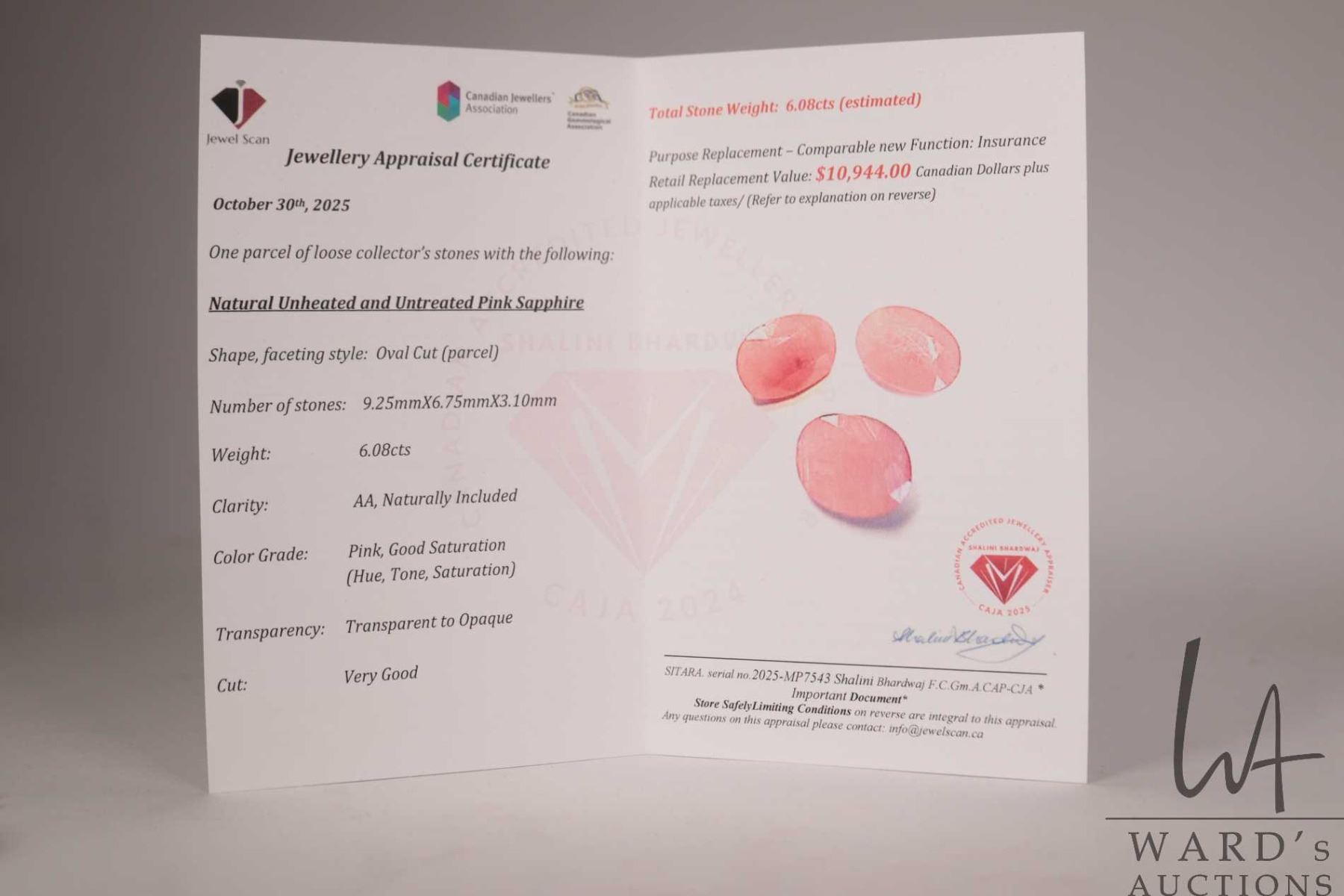 Three pink sapphire oval cut gemstones total 6.08 cts. with certificate provided by consignor